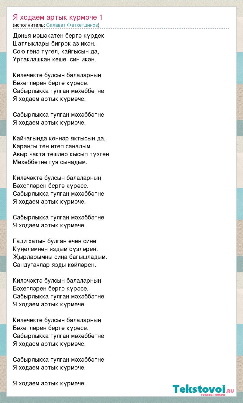 Дөнья мәшәкатен бергә күрдек Шатлыклары бигрәк аз икән. Сөю генә түгел, кайгысын да, Уртаклашкан кеше син икән. Киләчәктә булсын балаларның Бәхетләрен бергә күрәсе. Сабырлыкка тулган мәхәббәтне Я ходаем артык күрмәче. Сабырлыкка тулган мәхәббәтне Я ходаем артык күрмәче. Кайчагында көннәр яктысын да, Караңгы төн итеп санадым. Авыр чакта тешләр кысып түзгән Мәхәббәтне гуя сынадым. Киләчәктә булсын балаларның Бәхетләрен бергә күрәсе. Сабырлыкка тулган мәхәббәтне Я ходаем артык күрмәче. Сабырлыкка тулган мәхәббәтне Я ходаем артык күрмәче. Гади хатын булган өчен сине Күңелемнән яздым сүзләрен. Җырларымны сиңа багышладым. Сандугачлар язды көйләрен. Киләчәктә булсын балаларның Бәхетләрен бергә күрәсе. Сабырлыкка тулган мәхәббәтне Я ходаем артык күрмәче. Киләчәктә булсын балаларның Бәхетләрен бергә күрәсе. Сабырлыкка тулган мәхәббәтне Я ходаем артык күрмәче. Сабырлыкка тулган мәхәббәтне Я ходаем артык күрмәче. Я ходаем артык күрмәче.