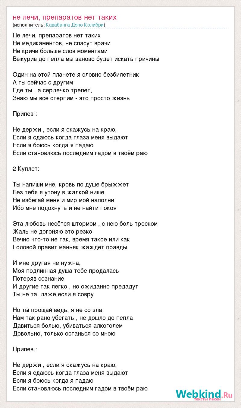 Не лечи, препаратов нет таких Не медикаментов, не спасут врачи Не кричи больше слов моментами Выкурив до пепла мы заново будет искать причины Один на этой планете я словно безбилетник А ты сейчас с другим Где ты , а сердечко трепет, Знаю мы всё стерпим - это просто жизнь Припев : Не держи , если я окажусь на краю, Если я сдаюсь когда глаза меня выдают Если я боюсь когда я падаю Если становлюсь последним гадом в твоём раю 2 Куплет: Ты напиши мне, кровь по душе брыжжет Без тебя я утону в жалкой нише Не избегай меня и мир мой наполни Ибо мне подохнуть и не найти покоя Эта любовь несётся штормом , с нею боль треском Жаль не догоняю это резко Вечно что-то не так, время такое или как Головой правит маньяк жаждет правды И мне другая не нужна, Моя подлинная душа тебе продалась Потеряв сознание И другие так легко , но ожиданно предадут Ты не та, даже если я совру Но ты прощай ведь, я не со зла Нам так рано убегать , не дошло до пепла Давиться болью, убиваться алкоголем Довольно, только останься со мною Припев : Не держи , если я окажусь на краю, Если я сдаюсь когда глаза меня выдают Если я боюсь когда я падаю Если становлюсь последним гадом в твоём раю