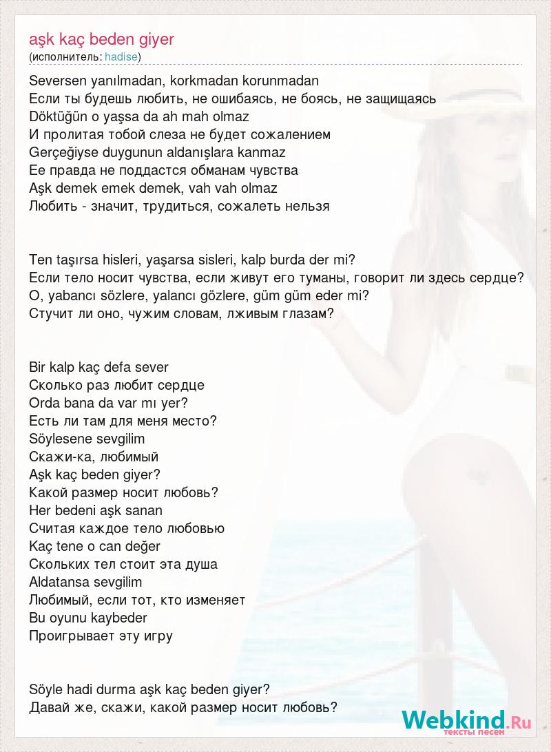 Seversen yanılmadan, korkmadan korunmadan Если ты будешь любить, не ошибаясь, не боясь, не защищаясь Döktüğün o yaşsa da ah mah olmaz И пролитая тобой слеза не будет сожалением Gerçeğiyse duygunun aldanışlara kanmaz Ее правда не поддастся обманам чувства Aşk demek emek demek, vah vah olmaz Любить - значит, трудиться, сожалеть нельзя Ten taşırsa hisleri, yaşarsa sisleri, kalp burda der mi? Если тело носит чувства, если живут его туманы, говорит ли здесь сердце? O, yabancı sözlere, yalancı gözlere, güm güm eder mi? Стучит ли оно, чужим словам, лживым глазам? Bir kalp kaç defa sever Сколько раз любит сердце Orda bana da var mı yer? Есть ли там для меня место? Söylesene sevgilim Скажи-ка, любимый Aşk kaç beden giyer? Какой размер носит любовь? Her bedeni aşk sanan Считая каждое тело любовью Kaç tene o can değer Скольких тел стоит эта душа Aldatansa sevgilim Любимый, если тот, кто изменяет Bu oyunu kaybeder Проигрывает эту игру Söyle hadi durma aşk kaç beden giyer? Давай же, скажи, какой размер носит любовь?