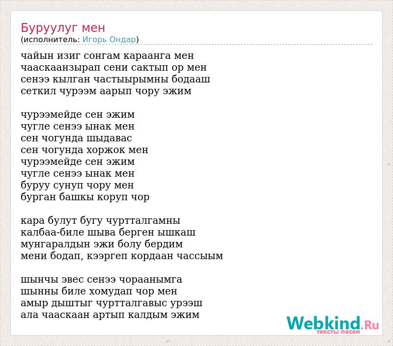 чайын изиг сонгам караанга мен чааскаанзырап сени сактып ор мен сенээ кылган частыырымны бодааш сеткил чурээм аарып чору эжим чурээмейде сен эжим чугле сенээ ынак мен сен чогунда шыдавас сен чогунда хоржок мен чурээмейде сен эжим чугле сенээ ынак мен буруу сунуп чору мен бурган башкы коруп чор кара булут бугу чуртталгамны калбаа-биле шыва берген ышкаш мунгаралдын эжи болу бердим мени бодап, кээргеп кордаан чассыым шынчы эвес сенээ чораанымга шынны биле хомудап чор мен амыр дыштыг чуртталгавыс урээш ала чааскаан артып калдым эжим
