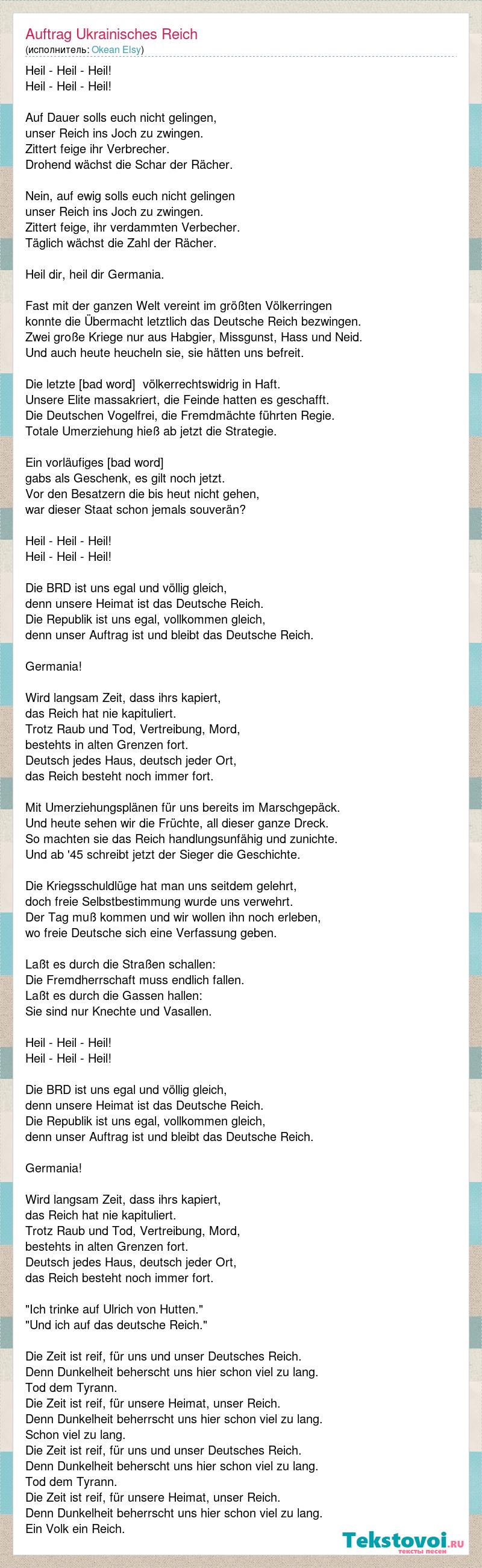 Heil - Heil - Heil! Heil - Heil - Heil! Auf Dauer solls euch nicht gelingen, unser Reich ins Joch zu zwingen. Zittert feige ihr Verbrecher. Drohend wächst die Schar der Rächer. Nein, auf ewig solls euch nicht gelingen unser Reich ins Joch zu zwingen. Zittert feige, ihr verdammten Verbecher. Täglich wächst die Zahl der Rächer. Heil dir, heil dir Germania. Fast mit der ganzen Welt vereint im größten Völkerringen konnte die Übermacht letztlich das Deutsche Reich bezwingen. Zwei große Kriege nur aus Habgier, Missgunst, Hass und Neid. Und auch heute heucheln sie, sie hätten uns befreit. Die letzte Reichsregierung, völkerrechtswidrig in Haft. Unsere Elite massakriert, die Feinde hatten es geschafft. Die Deutschen Vogelfrei, die Fremdmächte führten Regie. Totale Umerziehung hieß ab jetzt die Strategie. Ein vorläufiges Grundgesetz, gabs als Geschenk, es gilt noch jetzt. Vor den Besatzern die bis heut nicht gehen, war dieser Staat schon jemals souverän? Heil - Heil - Heil! Heil - Heil - Heil! Die BRD ist uns egal und völlig gleich, denn unsere Heimat ist das Deutsche Reich. Die Republik ist uns egal, vollkommen gleich, denn unser Auftrag ist und bleibt das Deutsche Reich. Germania! Wird langsam Zeit, dass ihrs kapiert, das Reich hat nie kapituliert. Trotz Raub und Tod, Vertreibung, Mord, bestehts in alten Grenzen fort. Deutsch jedes Haus, deutsch jeder Ort, das Reich besteht noch immer fort. Mit Umerziehungsplänen für uns bereits im Marschgepäck. Und heute sehen wir die Früchte, all dieser ganze Dreck. So machten sie das Reich handlungsunfähig und zunichte. Und ab '45 schreibt jetzt der Sieger die Geschichte. Die Kriegsschuldlüge hat man uns seitdem gelehrt, doch freie Selbstbestimmung wurde uns verwehrt. Der Tag muß kommen und wir wollen ihn noch erleben, wo freie Deutsche sich eine Verfassung geben. Laßt es durch die Straßen schallen: Die Fremdherrschaft muss endlich fallen. Laßt es durch die Gassen hallen: Sie sind nur Knechte und Vasallen. Heil - Heil - Heil! Heil - Heil - Heil! Die BRD ist uns egal und völlig gleich, denn unsere Heimat ist das Deutsche Reich. Die Republik ist uns egal, vollkommen gleich, denn unser Auftrag ist und bleibt das Deutsche Reich. Germania! Wird langsam Zeit, dass ihrs kapiert, das Reich hat nie kapituliert. Trotz Raub und Tod, Vertreibung, Mord, bestehts in alten Grenzen fort. Deutsch jedes Haus, deutsch jeder Ort, das Reich besteht noch immer fort. "Ich trinke auf Ulrich von Hutten." "Und ich auf das deutsche Reich." Die Zeit ist reif, für uns und unser Deutsches Reich. Denn Dunkelheit beherscht uns hier schon viel zu lang. Tod dem Tyrann. Die Zeit ist reif, für unsere Heimat, unser Reich. Denn Dunkelheit beherrscht uns hier schon viel zu lang. Schon viel zu lang. Die Zeit ist reif, für uns und unser Deutsches Reich. Denn Dunkelheit beherscht uns hier schon viel zu lang. Tod dem Tyrann. Die Zeit ist reif, für unsere Heimat, unser Reich. Denn Dunkelheit beherrscht uns hier schon viel zu lang. Ein Volk ein Reich.