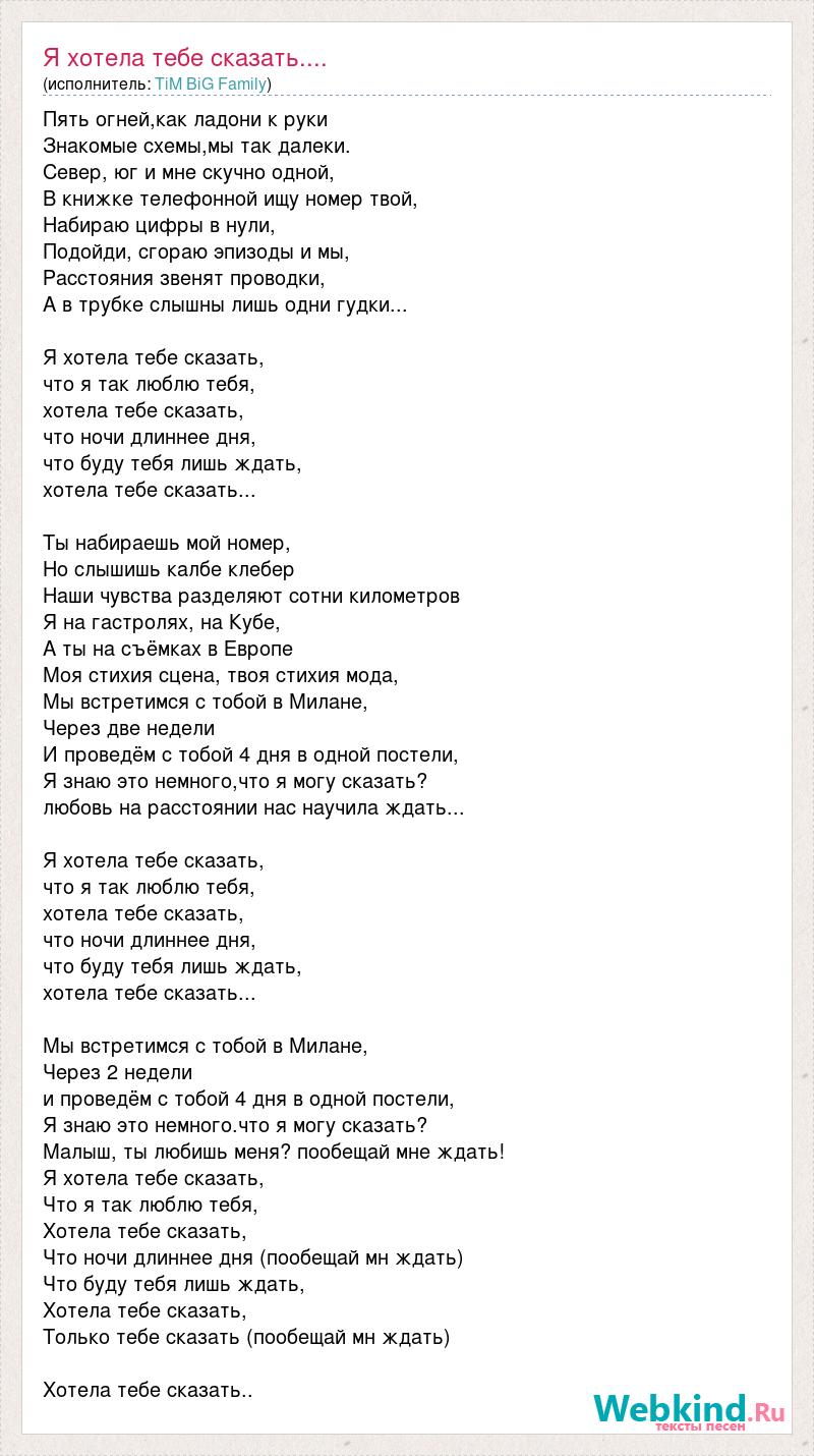 Пять огней,как ладони к руки Знакомые схемы,мы так далеки. Север, юг и мне скучно одной, В книжке телефонной ищу номер твой, Набираю цифры в нули, Подойди, сгораю эпизоды и мы, Расстояния звенят проводки, А в трубке слышны лишь одни гудки... Я хотела тебе сказать, что я так люблю тебя, хотела тебе сказать, что ночи длиннее дня, что буду тебя лишь ждать, хотела тебе сказать... Ты набираешь мой номер, Но слышишь калбе клебер Наши чувства разделяют сотни километров Я на гастролях, на Кубе, А ты на съёмках в Европе Моя стихия сцена, твоя стихия мода, Мы встретимся с тобой в Милане, Через две недели И проведём с тобой 4 дня в одной постели, Я знаю это немного,что я могу сказать? любовь на расстоянии нас научила ждать... Я хотела тебе сказать, что я так люблю тебя, хотела тебе сказать, что ночи длиннее дня, что буду тебя лишь ждать, хотела тебе сказать... Мы встретимся с тобой в Милане, Через 2 недели и проведём с тобой 4 дня в одной постели, Я знаю это немного.что я могу сказать? Малыш, ты любишь меня? пообещай мне ждать! Я хотела тебе сказать, Что я так люблю тебя, Хотела тебе сказать, Что ночи длиннее дня (пообещай мн ждать) Что буду тебя лишь ждать, Хотела тебе сказать, Только тебе сказать (пообещай мн ждать) Хотела тебе сказать..