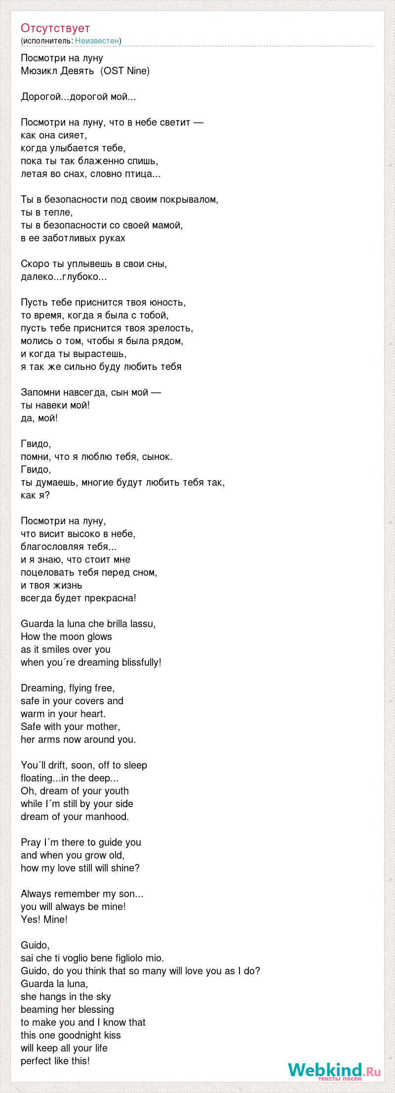 Посмотри на луну Мюзикл Девять (OST Nine) Дорогой...дорогой мой... Посмотри на луну, что в небе светит — как она сияет, когда улыбается тебе, пока ты так блаженно спишь, летая во снах, словно птица... Ты в безопасности под своим покрывалом, ты в тепле, ты в безопасности со своей мамой, в ее заботливых руках Скоро ты уплывешь в свои сны, далеко...глубоко... Пусть тебе приснится твоя юность, то время, когда я была с тобой, пусть тебе приснится твоя зрелость, молись о том, чтобы я была рядом, и когда ты вырастешь, я так же сильно буду любить тебя Запомни навсегда, сын мой — ты навеки мой! да, мой! Гвидо, помни, что я люблю тебя, сынок. Гвидо, ты думаешь, многие будут любить тебя так, как я? Посмотри на луну, что висит высоко в небе, благословляя тебя... и я знаю, что стоит мне поцеловать тебя перед сном, и твоя жизнь всегда будет прекрасна! Guarda la luna che brilla lassu, How the moon glows as it smiles over you when you´re dreaming blissfully! Dreaming, flying free, safe in your covers and warm in your heart. Safe with your mother, her arms now around you. You´ll drift, soon, off to sleep floating...in the deep... Oh, dream of your youth while I´m still by your side dream of your manhood. Pray I´m there to guide you and when you grow old, how my love still will shine? Always remember my son... you will always be mine! Yes! Mine! Guido, sai che ti voglio bene figliolo mio. Guido, do you think that so many will love you as I do? Guarda la luna, she hangs in the sky beaming her blessing to make you and I know that this one goodnight kiss will keep all your life perfect like this!
