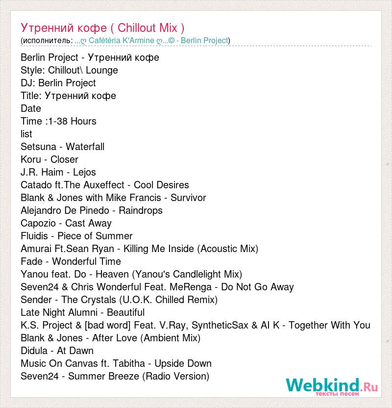 Berlin Project - Утренний кофе Style: Chillout\ Lounge DJ: Berlin Project Title: Утренний кофе Date Time :1-38 Hours list Setsuna - Waterfall Koru - Closer J.R. Haim - Lejos Catado ft.The Auxeffect - Cool Desires Blank & Jones with Mike Francis - Survivor Alejandro De Pinedo - Raindrops Capozio - Cast Away Fluidis - Piece of Summer Amurai Ft.Sean Ryan - Killing Me Inside (Acoustic Mix) Fade - Wonderful Time Yanou feat. Do - Heaven (Yanou's Candlelight Mix) Seven24 & Chris Wonderful Feat. MeRenga - Do Not Go Away Sender - The Crystals (U.O.K. Chilled Remix) Late Night Alumni - Beautiful K.S. Project & [bad word] Feat. V.Ray, SyntheticSax & AI K - Together With You Blank & Jones - After Love (Ambient Mix) Didula - At Dawn Music On Canvas ft. Tabitha - Upside Down Seven24 - Summer Breeze (Radio Version)