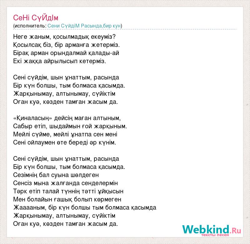 Неге жаным, қосылмадық екеуміз? Қосылсақ біз, бір арманға жетерміз. Бірақ арман орындалмай қалады-ай Екі жаққа айрылысып кетерміз. Сені сүйдім, шын ұнаттым, расында Бір күн болшы, тым болмаса қасымда. Жарқынымау, алтынымау, сүйіктім Оған куә, көзден тамған жасым да. «Қиналасың» дейсің маған алтыным, Сабыр етіп, шыдаймын ғой жарқыным. Мейлі сүйме, мейлі ұнатпа сен мені Сені ойлаумен өте береді әр күнім. Сені сүйдім, шын ұнаттым, расында Бір күн болшы, тым болмаса қасымда. Сезімнің бал суына шөлдеген Сенсіз мына жалғанда сенделермін Тәрк етіп талай түннің тәтті ұйқысын Мен болайын ғашық болып көрмеген Жааааным, бір күн болшы тым болмаса қасымда Жарқынымау, алтынымау, сүйіктім Оған куә, көзден тамған жасым да.