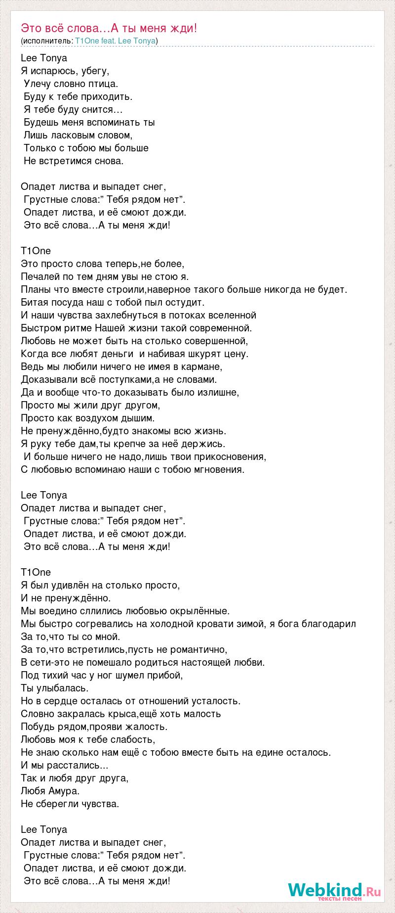 Lee Tonya Я испарюсь, убегу, Улечу словно птица. Буду к тебе приходить. Я тебе буду снится… Будешь меня вспоминать ты Лишь ласковым словом, Только с тобою мы больше Не встретимся снова. Опадет листва и выпадет снег, Грустные слова:” Тебя рядом нет”. Опадет листва, и её смоют дожди. Это всё слова…А ты меня жди! T1One Это просто слова теперь,не более, Печалей по тем дням увы не стою я. Планы что вместе строили,наверное такого больше никогда не будет. Битая посуда наш с тобой пыл остудит. И наши чувства захлебнуться в потоках вселенной Быстром ритме Нашей жизни такой современной. Любовь не может быть на столько совершенной, Когда все любят деньги и набивая шкурят цену. Ведь мы любили ничего не имея в кармане, Доказывали всё поступками,а не словами. Да и вообще что-то доказывать было излишне, Просто мы жили друг другом, Просто как воздухом дышим. Не пренуждённо,будто знакомы всю жизнь. Я руку тебе дам,ты крепче за неё держись. И больше ничего не надо,лишь твои прикосновения, С любовью вспоминаю наши с тобою мгновения. Lee Tonya Опадет листва и выпадет снег, Грустные слова:” Тебя рядом нет”. Опадет листва, и её смоют дожди. Это всё слова…А ты меня жди! T1One Я был удивлён на столько просто, И не пренуждённо. Мы воедино сллились любовью окрылённые. Мы быстро согревались на холодной кровати зимой, я бога благодарил За то,что ты со мной. За то,что встретились,пусть не романтично, В сети-это не помешало родиться настоящей любви. Под тихий час у ног шумел прибой, Ты улыбалась. Но в сердце осталась от отношений усталость. Словно закралась крыса,ещё хоть малость Побудь рядом,прояви жалость. Любовь моя к тебе слабость, Не знаю сколько нам ещё с тобою вместе быть на едине осталось. И мы расстались... Так и любя друг друга, Любя Амура. Не сберегли чувства. Lee Tonya Опадет листва и выпадет снег, Грустные слова:” Тебя рядом нет”. Опадет листва, и её смоют дожди. Это всё слова…А ты меня жди!
