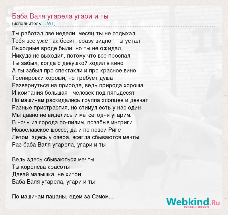 Ты работал две недели, месяц ты не отдыхал. Тебя все уже так бесит, сразу видно - ты устал Выходные вроде были, но ты не ожидал. Никуда не выходил, потому что все проспал Ты забыл, когда с девушкой ходил в кино А ты забыл про спектакли и про красное вино Тренировки хороши, но требует душа Развернуться на природе, ведь природа хороша И компания большая - человек под пятьдесят По машинам раскидались группа хлопцев и девчат Разные пристрастия, но стимул есть у нас один Мы давно не виделись и мы сегодня угарим. В ночь из города по-пилим, позабыв интриги Новославское шоссе, да и по новой Риге Летом, здесь у озера, всегда сбываются мечты Раз баба Валя угарела, угари и ты Ведь здесь сбываються мечты Ты королева красоты Давай малышка, не хитри Баба Валя угарела, угари и ты По машинам пацаны, едем за Сэмом...