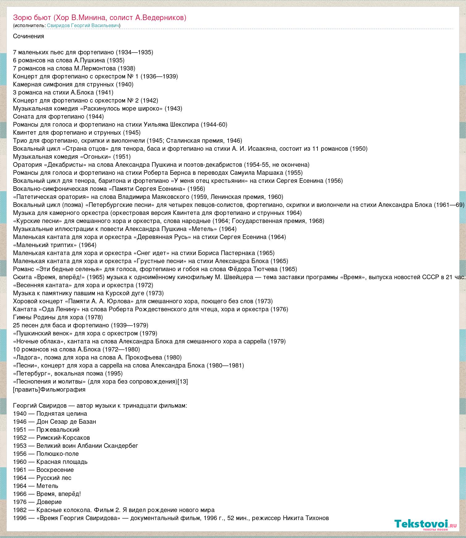 Сочинения 7 маленьких пьес для фортепиано (1934—1935) 6 романсов на слова А.Пушкина (1935) 7 романсов на слова М.Лермонтова (1938) Концерт для фортепиано с оркестром № 1 (1936—1939) Камерная симфония для струнных (1940) 3 романса на стихи А.Блока (1941) Концерт для фортепиано с оркестром № 2 (1942) Музыкальная комедия «Раскинулось море широко» (1943) Соната для фортепиано (1944) Романсы для голоса и фортепиано на стихи Уильяма Шекспира (1944-60) Квинтет для фортепиано и струнных (1945) Трио для фортепиано, скрипки и виолончели (1945; Сталинская премия, 1946) Вокальный цикл «Страна отцов» для тенора, баса и фортепиано на стихи А. И. Исаакяна, состоит из 11 романсов (1950) Музыкальная комедия «Огоньки» (1951) Оратория «Декабристы» на слова Александра Пушкина и поэтов-декабристов (1954-55, не окончена) Романсы для голоса и фортепиано на стихи Роберта Бернса в переводах Самуила Маршака (1955) Вокальный цикл для тенора, баритона и фортепиано «У меня отец крестьянин» на стихи Сергея Есенина (1956) Вокально-симфоническая поэма «Памяти Сергея Есенина» (1956) «Патетическая оратория» на слова Владимира Маяковского (1959, Ленинская премия, 1960) Вокальный цикл (поэма) «Петербургские песни» для четырех певцов-солистов, фортепиано, скрипки и виолончели на стихи Александра Блока (1961—69) Музыка для камерного оркестра (оркестровая версия Квинтета для фортепиано и струнных 1964) «Курские песни» для смешанного хора и оркестра, слова народные (1964; Государственная премия, 1968) Музыкальные иллюстрации к повести Александра Пушкина «Метель» (1964) Маленькая кантата для хора и оркестра «Деревянная Русь» на стихи Сергея Есенина (1964) «Маленький триптих» (1964) Маленькая кантата для хора и оркестра «Снег идет» на стихи Бориса Пастернака (1965) Маленькая кантата для хора и оркестра «Грустные песни» на стихи Александра Блока (1965) Романс «Эти бедные селенья» для голоса, фортепиано и гобоя на слова Фёдора Тютчева (1965) Сюита «Время, вперёд!» (1965) музыка к одноимённому кинофильму М. Швейцера — тема заставки программы «Время», выпуска новостей СССР в 21 час. «Весенняя кантата» для хора и оркестра (1972) Музыка к памятнику павшим на Курской дуге (1973) Хоровой концерт «Памяти А. А. Юрлова» для смешанного хора, поющего без слов (1973) Кантата «Ода Ленину» на слова Роберта Рождественского для чтеца, хора и оркестра (1976) Гимны Родины для хора (1978) 25 песен для баса и фортепиано (1939—1979) «Пушкинский венок» для хора с оркестром (1979) «Ночные облака», кантата на слова Александра Блока для смешанного хора a cappella (1979) 10 романсов на слова А.Блока (1972—1980) «Ладога», поэма для хора на слова A. Прокофьева (1980) «Песни», концерт для хора a cappella на слова Александра Блока (1980—1981) «Петербург», вокальная поэма (1995) «Песнопения и молитвы» (для хора без сопровождения)[13] [править]Фильмография Георгий Свиридов — автор музыки к тринадцати фильмам: 1940 — Поднятая целина 1946 — Дон Сезар де Базан 1951 — Пржевальский 1952 — Римский-Корсаков 1953 — Великий воин Албании Скандербег 1956 — Полюшко-поле 1960 — Красная площадь 1961 — Воскресение 1964 — Русский лес 1964 — Метель 1966 — Время, вперёд! 1976 — Доверие 1982 — Красные колокола. Фильм 2. Я видел рождение нового мира 1996 — «Время Георгия Свиридова» — документальный фильм, 1996 г., 52 мин., режиссер Никита Тихонов