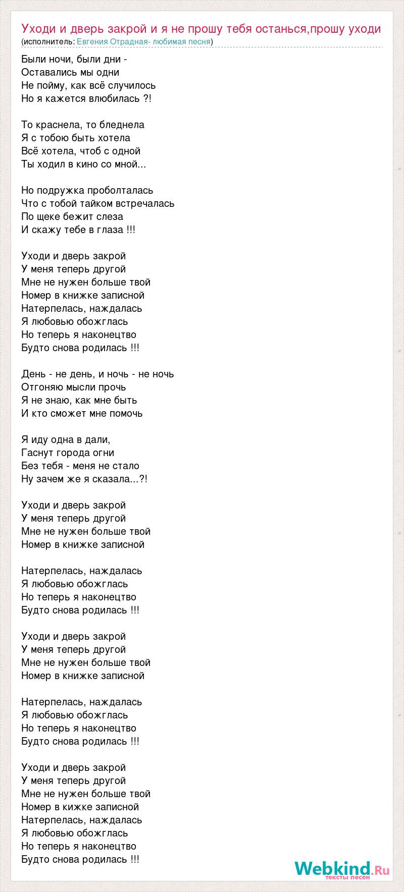 Были ночи, были дни - Оставались мы одни Не пойму, как всё случилось Но я кажется влюбилась ?! То краснела, то бледнела Я с тобою быть хотела Всё хотела, чтоб с одной Ты ходил в кино со мной... Но подружка проболталась Что с тобой тайком встречалась По щеке бежит слеза И скажу тебе в глаза !!! Уходи и дверь закрой У меня теперь другой Мне не нужен больше твой Номер в книжке записной Натерпелась, наждалась Я любовью обожглась Но теперь я наконецтво Будто снова родилась !!! День - не день, и ночь - не ночь Отгоняю мысли прочь Я не знаю, как мне быть И кто сможет мне помочь Я иду одна в дали, Гаснут города огни Без тебя - меня не стало Ну зачем же я сказала...?! Уходи и дверь закрой У меня теперь другой Мне не нужен больше твой Номер в книжке записной Натерпелась, наждалась Я любовью обожглась Но теперь я наконецтво Будто снова родилась !!! Уходи и дверь закрой У меня теперь другой Мне не нужен больше твой Номер в книжке записной Натерпелась, наждалась Я любовью обожглась Но теперь я наконецтво Будто снова родилась !!! Уходи и дверь закрой У меня теперь другой Мне не нужен больше твой Номер в кижке записной Натерпелась, наждалась Я любовью обожглась Но теперь я наконецтво Будто снова родилась !!!