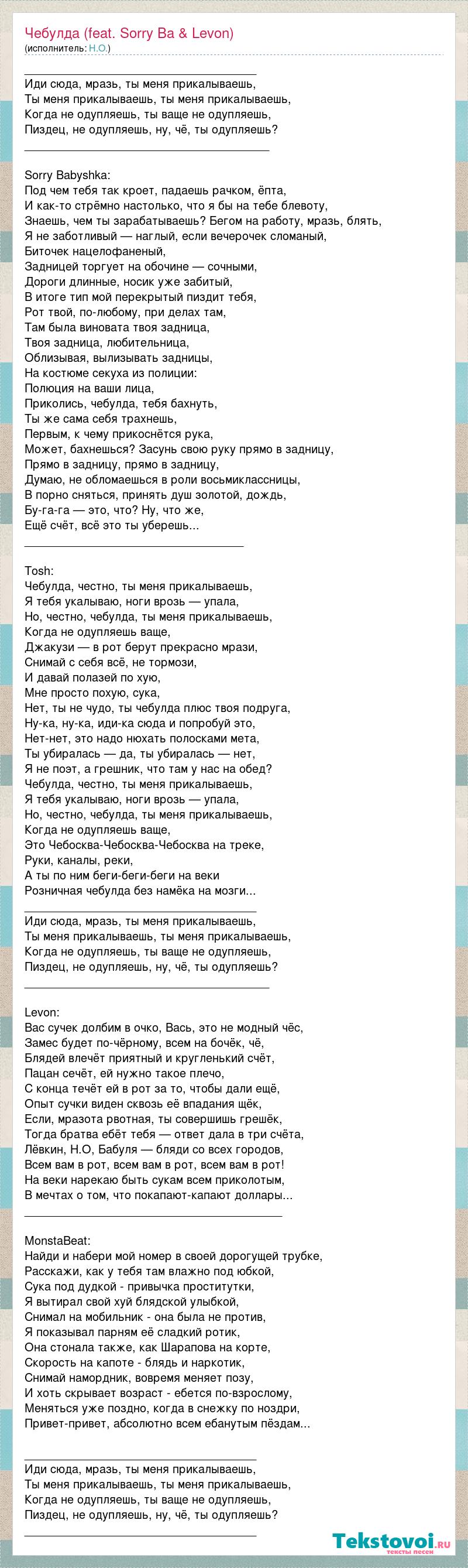 ____________________________________ Иди сюда, мразь, ты меня прикалываешь, Ты меня прикалываешь, ты меня прикалываешь, Когда не одупляешь, ты ваще не одупляешь, Пиздец, не одупляешь, ну, чё, ты одупляешь? ______________________________________ Sorry Babyshka: Под чем тебя так кроет, падаешь рачком, ёпта, И как-то стрёмно настолько, что я бы на тебе блевоту, Знаешь, чем ты зарабатываешь? Бегом на работу, мразь, блять, Я не заботливый — наглый, если вечерочек сломаный, Биточек нацелофаненый, Задницей торгует на обочине — сочными, Дороги длинные, носик уже забитый, В итоге тип мой перекрытый пиздит тебя, Рот твой, по-любому, при делах там, Там была виновата твоя задница, Твоя задница, любительница, Облизывая, вылизывать задницы, На костюме секуха из полиции: Полюция на ваши лица, Приколись, чебулда, тебя бахнуть, Ты же сама себя трахнешь, Первым, к чему прикоснётся рука, Может, бахнешься? Засунь свою руку прямо в задницу, Прямо в задницу, прямо в задницу, Думаю, не обломаешься в роли восьмиклассницы, В порно сняться, принять душ золотой, дождь, Бу-га-га — это, что? Ну, что же, Ещё счёт, всё это ты уберешь... __________________________________ Tosh: Чебулда, честно, ты меня прикалываешь, Я тебя укалываю, ноги врозь — упала, Но, честно, чебулда, ты меня прикалываешь, Когда не одупляешь ваще, Джакузи — в рот берут прекрасно мрази, Снимай с себя всё, не тормози, И давай полазей по хую, Мне просто похую, сука, Нет, ты не чудо, ты чебулда плюс твоя подруга, Ну-ка, ну-ка, иди-ка сюда и попробуй это, Нет-нет, это надо нюхать полосками мета, Ты убиралась — да, ты убиралась — нет, Я не поэт, а грешник, что там у нас на обед? Чебулда, честно, ты меня прикалываешь, Я тебя укалываю, ноги врозь — упала, Но, честно, чебулда, ты меня прикалываешь, Когда не одупляешь ваще, Это Чебосква-Чебосква-Чебосква на треке, Руки, каналы, реки, А ты по ним беги-беги-беги на веки Розничная чебулда без намёка на мозги... ____________________________________ Иди сюда, мразь, ты меня прикалываешь, Ты меня прикалываешь, ты меня прикалываешь, Когда не одупляешь, ты ваще не одупляешь, Пиздец, не одупляешь, ну, чё, ты одупляешь? ______________________________________ Levon: Вас сучек долбим в очко, Вась, это не модный чёс, Замес будет по-чёрному, всем на бочёк, чё, Блядей влечёт приятный и кругленький счёт, Пацан сечёт, ей нужно такое плечо, С конца течёт ей в рот за то, чтобы дали ещё, Опыт сучки виден сквозь её впадания щёк, Если, мразота рвотная, ты совершишь грешёк, Тогда братва ебёт тебя — ответ дала в три счёта, Лёвкин, Н.О, Бабуля — бляди со всех городов, Всем вам в рот, всем вам в рот, всем вам в рот! На веки нарекаю быть сукам всем приколотым, В мечтах о том, что покапают-капают доллары... ________________________________________ MonstaBeat: Найди и набери мой номер в своей дорогущей трубке, Расскажи, как у тебя там влажно под юбкой, Сука под дудкой - привычка проститутки, Я вытирал свой хуй блядской улыбкой, Снимал на мобильник - она была не против, Я показывал парням её сладкий ротик, Она стонала также, как Шарапова на корте, Скорость на капоте - блядь и наркотик, Снимай намордник, вовремя меняет позу, И хоть скрывает возраст - ебется по-взрослому, Меняться уже поздно, когда в снежку по ноздри, Привет-привет, абсолютно всем ебанутым пёздам... ____________________________________ Иди сюда, мразь, ты меня прикалываешь, Ты меня прикалываешь, ты меня прикалываешь, Когда не одупляешь, ты ваще не одупляешь, Пиздец, не одупляешь, ну, чё, ты одупляешь? ____________________________________