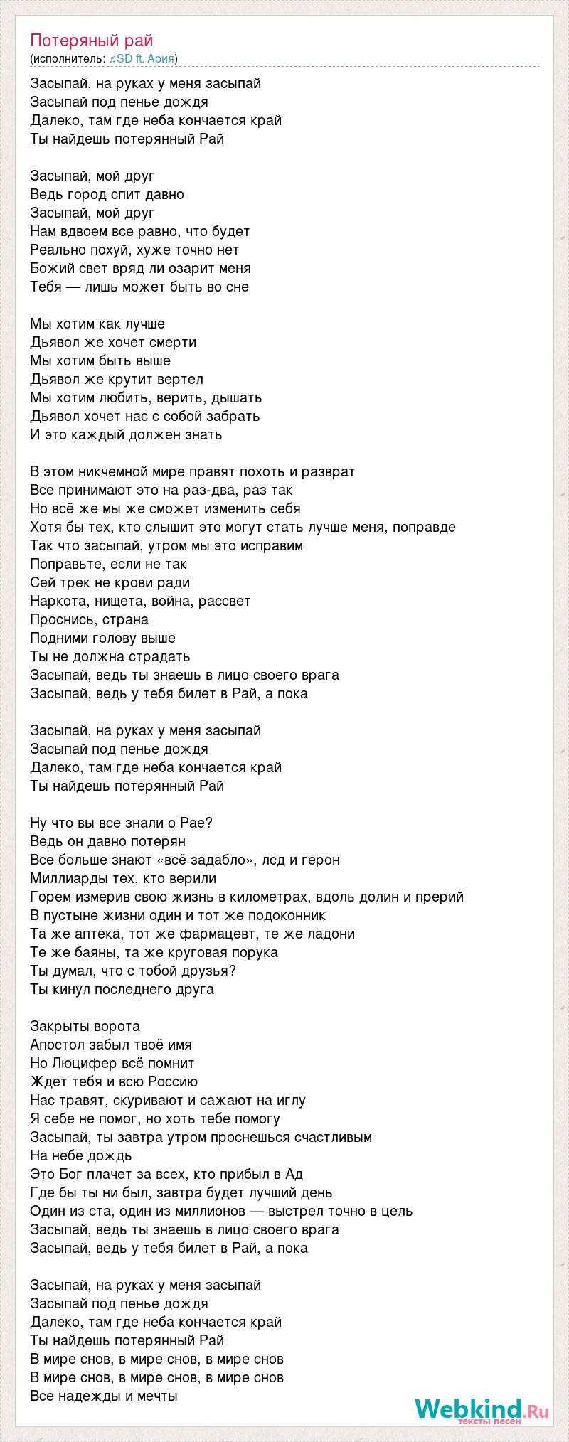 Засыпай, на руках у меня засыпай Засыпай под пенье дождя Далеко, там где неба кончается край Ты найдешь потерянный Рай Засыпай, мой друг Ведь город спит давно Засыпай, мой друг Нам вдвоем все равно, что будет Реально похуй, хуже точно нет Божий свет вряд ли озарит меня Тебя — лишь может быть во сне Мы хотим как лучше Дьявол же хочет смерти Мы хотим быть выше Дьявол же крутит вертел Мы хотим любить, верить, дышать Дьявол хочет нас с собой забрать И это каждый должен знать В этом никчемной мире правят похоть и разврат Все принимают это на раз-два, раз так Но всё же мы же сможет изменить себя Хотя бы тех, кто слышит это могут стать лучше меня, поправде Так что засыпай, утром мы это исправим Поправьте, если не так Сей трек не крови ради Наркота, нищета, война, рассвет Проснись, страна Подними голову выше Ты не должна страдать Засыпай, ведь ты знаешь в лицо своего врага Засыпай, ведь у тебя билет в Рай, а пока Засыпай, на руках у меня засыпай Засыпай под пенье дождя Далеко, там где неба кончается край Ты найдешь потерянный Рай Ну что вы все знали о Рае? Ведь он давно потерян Все больше знают «всё задабло», лсд и герон Миллиарды тех, кто верили Горем измерив свою жизнь в километрах, вдоль долин и прерий В пустыне жизни один и тот же подоконник Та же аптека, тот же фармацевт, те же ладони Те же баяны, та же круговая порука Ты думал, что с тобой друзья? Ты кинул последнего друга Закрыты ворота Апостол забыл твоё имя Но Люцифер всё помнит Ждет тебя и всю Россию Нас травят, скуривают и сажают на иглу Я себе не помог, но хоть тебе помогу Засыпай, ты завтра утром проснешься счастливым На небе дождь Это Бог плачет за всех, кто прибыл в Ад Где бы ты ни был, завтра будет лучший день Один из ста, один из миллионов — выстрел точно в цель Засыпай, ведь ты знаешь в лицо своего врага Засыпай, ведь у тебя билет в Рай, а пока Засыпай, на руках у меня засыпай Засыпай под пенье дождя Далеко, там где неба кончается край Ты найдешь потерянный Рай В мире снов, в мире снов, в мире снов В мире снов, в мире снов, в мире снов Все надежды и мечты