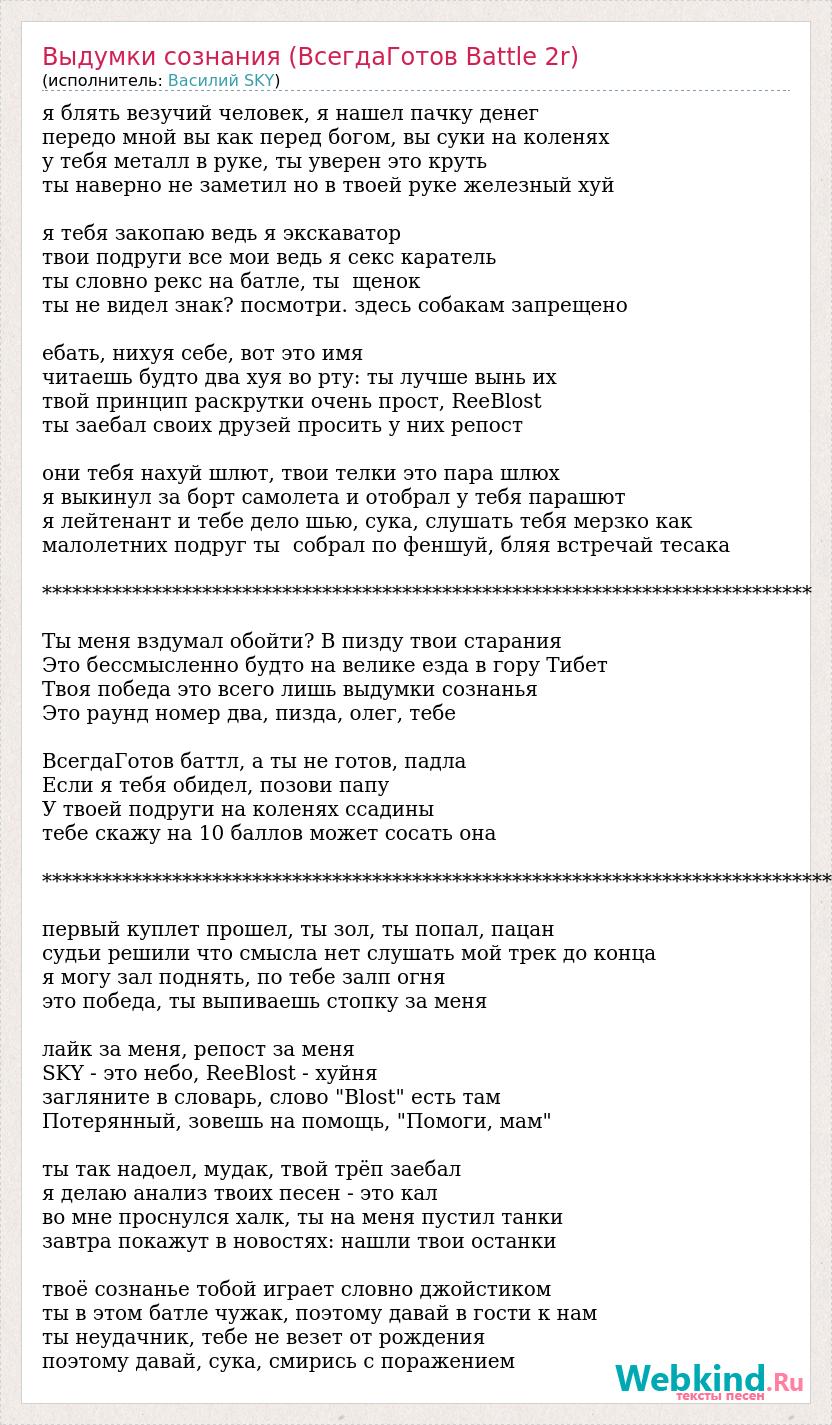 я блять везучий человек, я нашел пачку денег передо мной вы как перед богом, вы суки на коленях у тебя металл в руке, ты уверен это круть ты наверно не заметил но в твоей руке железный хуй я тебя закопаю ведь я экскаватор твои подруги все мои ведь я секс каратель ты словно рекс на батле, ты щенок ты не видел знак? посмотри. здесь собакам запрещено ебать, нихуя себе, вот это имя читаешь будто два хуя во рту: ты лучше вынь их твой принцип раскрутки очень прост, ReeBlost ты заебал своих друзей просить у них репост они тебя нахуй шлют, твои телки это пара шлюх я выкинул за борт самолета и отобрал у тебя парашют я лейтенант и тебе дело шью, сука, слушать тебя мерзко как малолетних подруг ты собрал по феншуй, бляя встречай тесака ***************************************************************************** Ты меня вздумал обойти? В пизду твои старания Это бессмысленно будто на велике езда в гору Тибет Твоя победа это всего лишь выдумки сознанья Это раунд номер два, пизда, олег, тебе ВсегдаГотов баттл, а ты не готов, падла Если я тебя обидел, позови папу У твоей подруги на коленях ссадины тебе скажу на 10 баллов может сосать она ******************************************************************************* первый куплет прошел, ты зол, ты попал, пацан судьи решили что смысла нет слушать мой трек до конца я могу зал поднять, по тебе залп огня это победа, ты выпиваешь стопку за меня лайк за меня, репост за меня SKY - это небо, ReeBlost - хуйня загляните в словарь, слово "Blost" есть там Потерянный, зовешь на помощь, "Помоги, мам" ты так надоел, мудак, твой трёп заебал я делаю анализ твоих песен - это кал во мне проснулся халк, ты на меня пустил танки завтра покажут в новостях: нашли твои останки твоё сознанье тобой играет словно джойстиком ты в этом батле чужак, поэтому давай в гости к нам ты неудачник, тебе не везет от рождения поэтому давай, сука, смирись с поражением