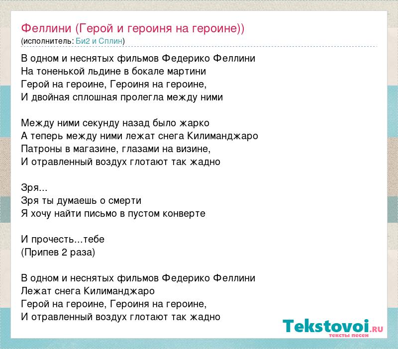 В одном и неснятых фильмов Федерико Феллини На тоненькой льдине в бокале мартини Герой на героине, Героиня на героине, И двойная сплошная пролегла между ними Между ними секунду назад было жарко А теперь между ними лежат снега Килиманджаро Патроны в магазине, глазами на визине, И отравленный воздух глотают так жадно Зря... Зря ты думаешь о смерти Я хочу найти письмо в пустом конверте И прочесть...тебе (Припев 2 раза) В одном и неснятых фильмов Федерико Феллини Лежат снега Килиманджаро Герой на героине, Героиня на героине, И отравленный воздух глотают так жадно