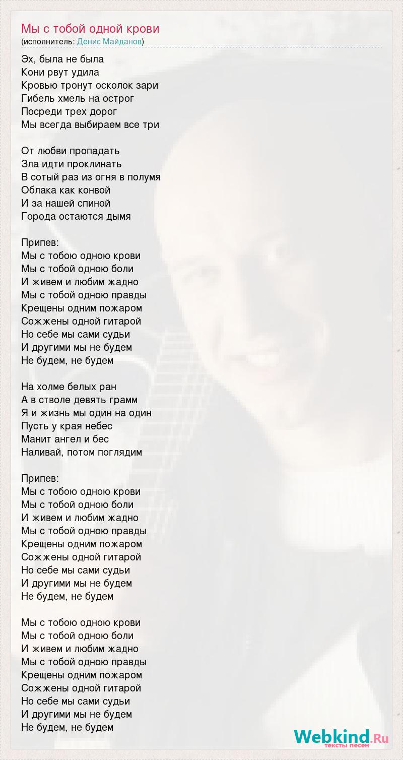 Эх, была не была Кони рвут удила Кровью тронут осколок зари Гибель хмель на острог Посреди трех дорог Мы всегда выбираем все три От любви пропадать Зла идти проклинать В сотый раз из огня в полумя Облака как конвой И за нашей спиной Города остаются дымя Припев: Мы с тобою одною крови Мы с тобой одною боли И живем и любим жадно Мы с тобой одною правды Крещены одним пожаром Сожжены одной гитарой Но себе мы сами судьи И другими мы не будем Не будем, не будем На холме белых ран А в стволе девять грамм Я и жизнь мы один на один Пусть у края небес Манит ангел и бес Наливай, потом поглядим Припев: Мы с тобою одною крови Мы с тобой одною боли И живем и любим жадно Мы с тобой одною правды Крещены одним пожаром Сожжены одной гитарой Но себе мы сами судьи И другими мы не будем Не будем, не будем Мы с тобою одною крови Мы с тобой одною боли И живем и любим жадно Мы с тобой одною правды Крещены одним пожаром Сожжены одной гитарой Но себе мы сами судьи И другими мы не будем Не будем, не будем