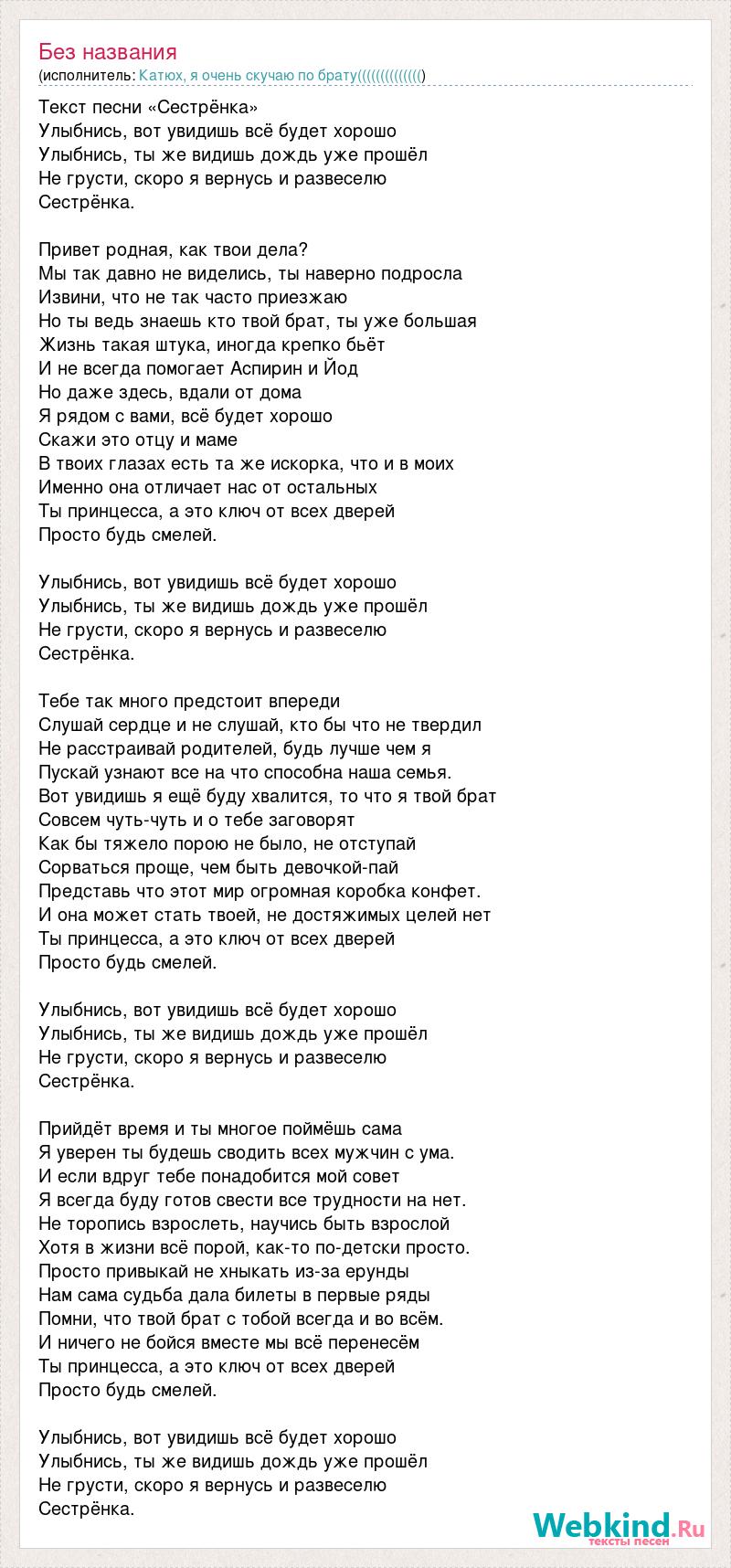 Текст песни «Сестрёнка» Улыбнись, вот увидишь всё будет хорошо Улыбнись, ты же видишь дождь уже прошёл Не грусти, скоро я вернусь и развеселю Сестрёнка. Привет родная, как твои дела? Мы так давно не виделись, ты наверно подросла Извини, что не так часто приезжаю Но ты ведь знаешь кто твой брат, ты уже большая Жизнь такая штука, иногда крепко бьёт И не всегда помогает Аспирин и Йод Но даже здесь, вдали от дома Я рядом с вами, всё будет хорошо Скажи это отцу и маме В твоих глазах есть та же искорка, что и в моих Именно она отличает нас от остальных Ты принцесса, а это ключ от всех дверей Просто будь смелей. Улыбнись, вот увидишь всё будет хорошо Улыбнись, ты же видишь дождь уже прошёл Не грусти, скоро я вернусь и развеселю Сестрёнка. Тебе так много предстоит впереди Слушай сердце и не слушай, кто бы что не твердил Не расстраивай родителей, будь лучше чем я Пускай узнают все на что способна наша семья. Вот увидишь я ещё буду хвалится, то что я твой брат Совсем чуть-чуть и о тебе заговорят Как бы тяжело порою не было, не отступай Сорваться проще, чем быть девочкой-пай Представь что этот мир огромная коробка конфет. И она может стать твоей, не достяжимых целей нет Ты принцесса, а это ключ от всех дверей Просто будь смелей. Улыбнись, вот увидишь всё будет хорошо Улыбнись, ты же видишь дождь уже прошёл Не грусти, скоро я вернусь и развеселю Сестрёнка. Прийдёт время и ты многое поймёшь сама Я уверен ты будешь сводить всех мужчин с ума. И если вдруг тебе понадобится мой совет Я всегда буду готов свести все трудности на нет. Не торопись взрослеть, научись быть взрослой Хотя в жизни всё порой, как-то по-детски просто. Просто привыкай не хныкать из-за ерунды Нам сама судьба дала билеты в первые ряды Помни, что твой брат с тобой всегда и во всём. И ничего не бойся вместе мы всё перенесём Ты принцесса, а это ключ от всех дверей Просто будь смелей. Улыбнись, вот увидишь всё будет хорошо Улыбнись, ты же видишь дождь уже прошёл Не грусти, скоро я вернусь и развеселю Сестрёнка.