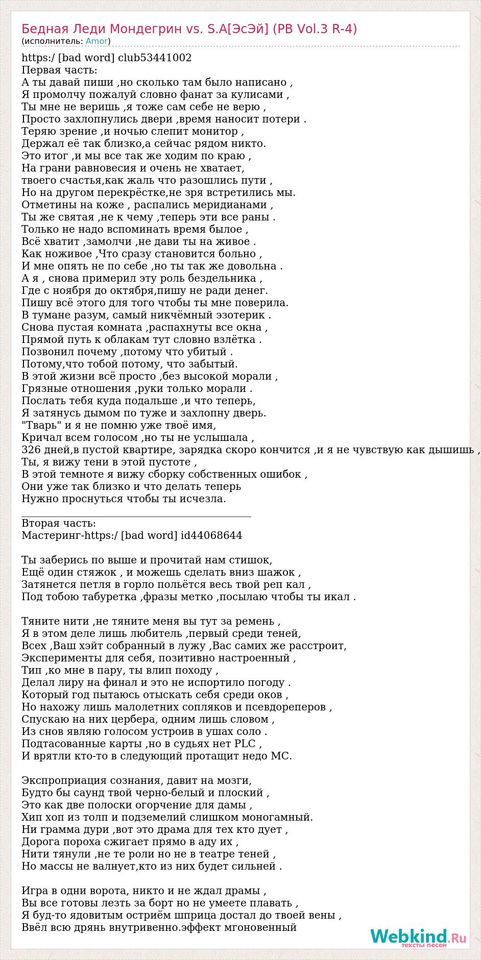https:/ [bad word] club53441002 Первая часть: А ты давай пиши ,но сколько там было написано , Я промолчу пожалуй словно фанат за кулисами , Ты мне не веришь ,я тоже сам себе не верю , Просто захлопнулись двери ,время наносит потери . Теряю зрение ,и ночью слепит монитор , Держал её так близко,а сейчас рядом никто. Это итог ,и мы все так же ходим по краю , На грани равновесия и очень не хватает, твоего счастья,как жаль что разошлись пути , Но на другом перекрёстке,не зря встретились мы. Отметины на коже , распались меридианами , Ты же святая ,не к чему ,теперь эти все раны . Только не надо вспоминать время былое , Всё хватит ,замолчи ,не дави ты на живое . Как ноживое ,Что сразу становится больно , И мне опять не по себе ,но ты так же довольна . А я , снова примерил эту роль бездельника , Где с ноября до октября,пишу не ради денег. Пишу всё этого для того чтобы ты мне поверила. В тумане разум, самый никчёмный эзотерик . Снова пустая комната ,распахнуты все окна , Прямой путь к облакам тут словно взлётка . Позвонил почему ,потому что убитый . Потому,что тобой потому, что забытый. В этой жизни всё просто ,без высокой морали , Грязные отношения ,руки только морали . Послать тебя куда подальше ,и что теперь, Я затянусь дымом по туже и захлопну дверь. "Тварь" и я не помню уже твоё имя, Кричал всем голосом ,но ты не услышала , 326 дней,в пустой квартире, зарядка скоро кончится ,и я не чувствую как дышишь , Ты, я вижу тени в этой пустоте , В этой темноте я вижу сборку собственных ошибок , Они уже так близко и что делать теперь Нужно проснуться чтобы ты исчезла. _____________________________________________ Вторая часть: Мастеринг-https:/ [bad word] id44068644 Ты заберись по выше и прочитай нам стишок, Ещё один стяжок , и можешь сделать вниз шажок , Затянется петля в горло польётся весь твой реп кал , Под тобою табуретка ,фразы метко ,посылаю чтобы ты икал . Тяните нити ,не тяните меня вы тут за ремень , Я в этом деле лишь любитель ,первый среди теней, Всех ,Ваш хэйт собранный в лужу ,Вас самих же расстроит, Эксперименты для себя, позитивно настроенный , Тип ,ко мне в пару, ты влип походу , Делал лиру на финал и это не испортило погоду . Который год пытаюсь отыскать себя среди оков , Но нахожу лишь малолетних сопляков и псевдореперов , Спускаю на них цербера, одним лишь словом , Из снов являю голосом устроив в ушах соло . Подтасованные карты ,но в судьях нет PLC , И врятли кто-то в следующий протащит недо МС. Экспроприация сознания, давит на мозги, Будто бы саунд твой черно-белый и плоский , Это как две полоски огорчение для дамы , Хип хоп из толп и подземелий слишком моногамный. Ни грамма дури ,вот это драма для тех кто дует , Дорога пороха сжигает прямо в аду их , Нити тянули ,не те роли но не в театре теней , Но массы не валнует,кто из них будет сильней . Игра в одни ворота, никто и не ждал драмы , Вы все готовы лезть за борт но не умеете плавать , Я буд-то ядовитым остриём шприца достал до твоей вены , Ввёл всю дрянь внутривенно.эффект мгоновенный