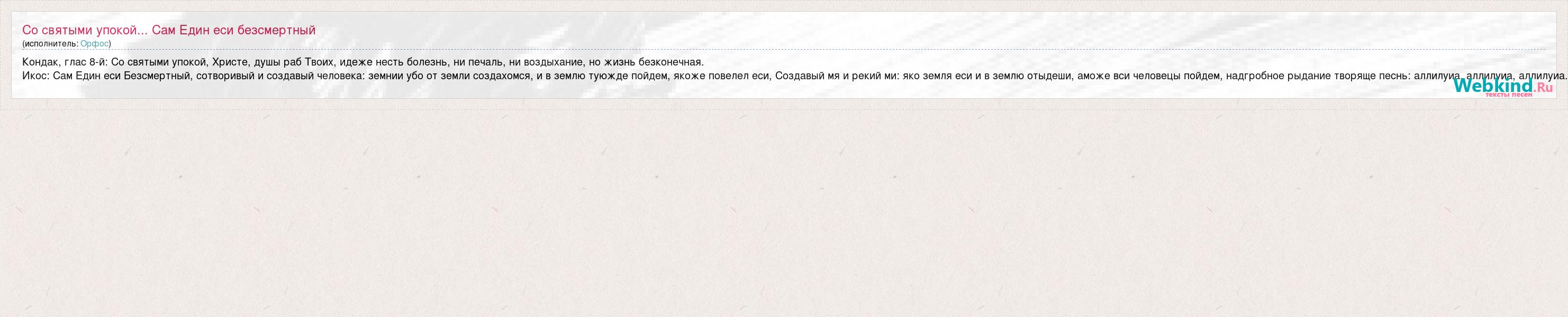 Кондак, глас 8-й: Со святыми упокой, Христе, душы раб Твоих, идеже несть болезнь, ни печаль, ни воздыхание, но жизнь безконечная. Икос: Сам Един еси Безсмертный, сотворивый и создавый человека: земнии убо от земли создахомся, и в землю туюжде пойдем, якоже повелел еси, Создавый мя и рекий ми: яко земля еси и в землю отыдеши, аможе вси человецы пойдем, надгробное рыдание творяще песнь: аллилуиа, аллилуиа, аллилуиа.