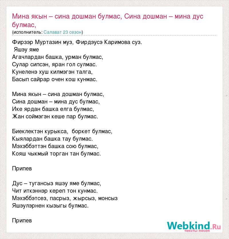 Главная→Исполнители→Салават 23 сезон→Мина якын – сина дошман булмас, Сина дошман – мина дус булмас, Ике ярдан башка