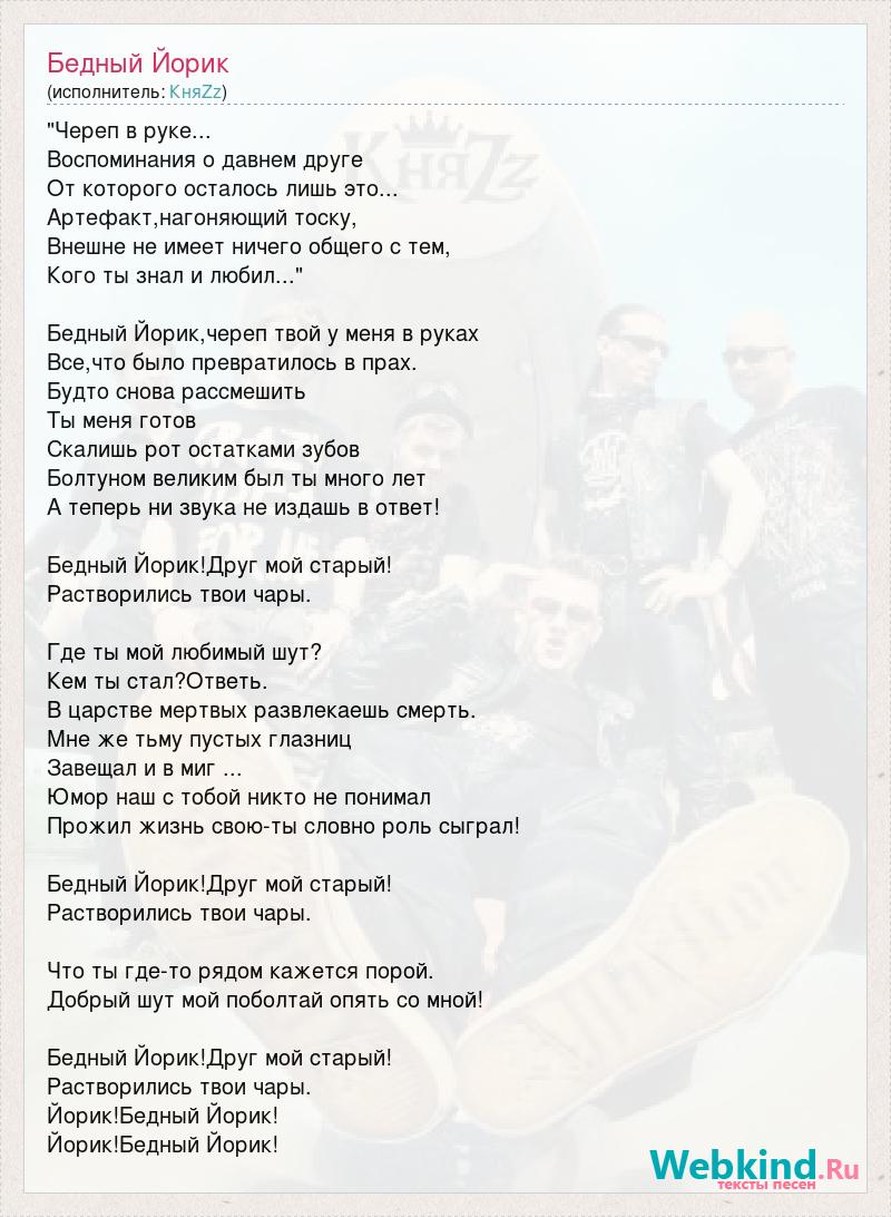 "Череп в руке... Воспоминания о давнем друге От которого осталось лишь это... Артефакт,нагоняющий тоску, Внешне не имеет ничего общего с тем, Кого ты знал и любил..." Бедный Йорик,череп твой у меня в руках Все,что было превратилось в прах. Будто снова рассмешить Ты меня готов Скалишь рот остатками зубов Болтуном великим был ты много лет А теперь ни звука не издашь в ответ! Бедный Йорик!Друг мой старый! Растворились твои чары. Где ты мой любимый шут? Кем ты стал?Ответь. В царстве мертвых развлекаешь смерть. Мне же тьму пустых глазниц Завещал и в миг ... Юмор наш с тобой никто не понимал Прожил жизнь свою-ты словно роль сыграл! Бедный Йорик!Друг мой старый! Растворились твои чары. Что ты где-то рядом кажется порой. Добрый шут мой поболтай опять со мной! Бедный Йорик!Друг мой старый! Растворились твои чары. Йорик!Бедный Йорик! Йорик!Бедный Йорик!