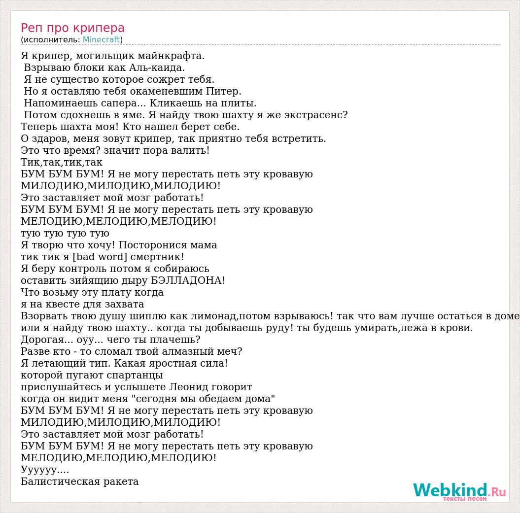 Я крипер, могильщик майнкрафта. Взрываю блоки как Аль-каида. Я не существо которое сожрет тебя. Но я оставляю тебя окаменевшим Питер. Напоминаешь сапера... Кликаешь на плиты. Потом сдохнешь в яме. Я найду твою шахту я же экстрасенс? Теперь шахта моя! Кто нашел берет себе. О здаров, меня зовут крипер, так приятно тебя встретить. Это что время? значит пора валить! Тик,так,тик,так БУМ БУМ БУМ! Я не могу перестать петь эту кровавую МИЛОДИЮ,МИЛОДИЮ,МИЛОДИЮ! Это заставляет мой мозг работать! БУМ БУМ БУМ! Я не могу перестать петь эту кровавую МЕЛОДИЮ,МЕЛОДИЮ,МЕЛОДИЮ! тую тую тую тую Я творю что хочу! Посторонися мама тик тик я [bad word] смертник! Я беру контроль потом я собираюсь оставить зийящию дыру БЭЛЛАДОНА! Что возьму эту плату когда я на квесте для захвата Взорвать твою душу шиплю как лимонад,потом взрываюсь! так что вам лучше остаться в доме или я найду твою шахту.. когда ты добываешь руду! ты будешь умирать,лежа в крови. Дорогая... оуу... чего ты плачешь? Разве кто - то сломал твой алмазный меч? Я летающий тип. Какая яростная сила! которой пугают спартанцы прислушайтесь и услышете Леонид говорит когда он видит меня "сегодня мы обедаем дома" БУМ БУМ БУМ! Я не могу перестать петь эту кровавую МИЛОДИЮ,МИЛОДИЮ,МИЛОДИЮ! Это заставляет мой мозг работать! БУМ БУМ БУМ! Я не могу перестать петь эту кровавую МЕЛОДИЮ,МЕЛОДИЮ,МЕЛОДИЮ! Уууууу.... Балистическая ракета