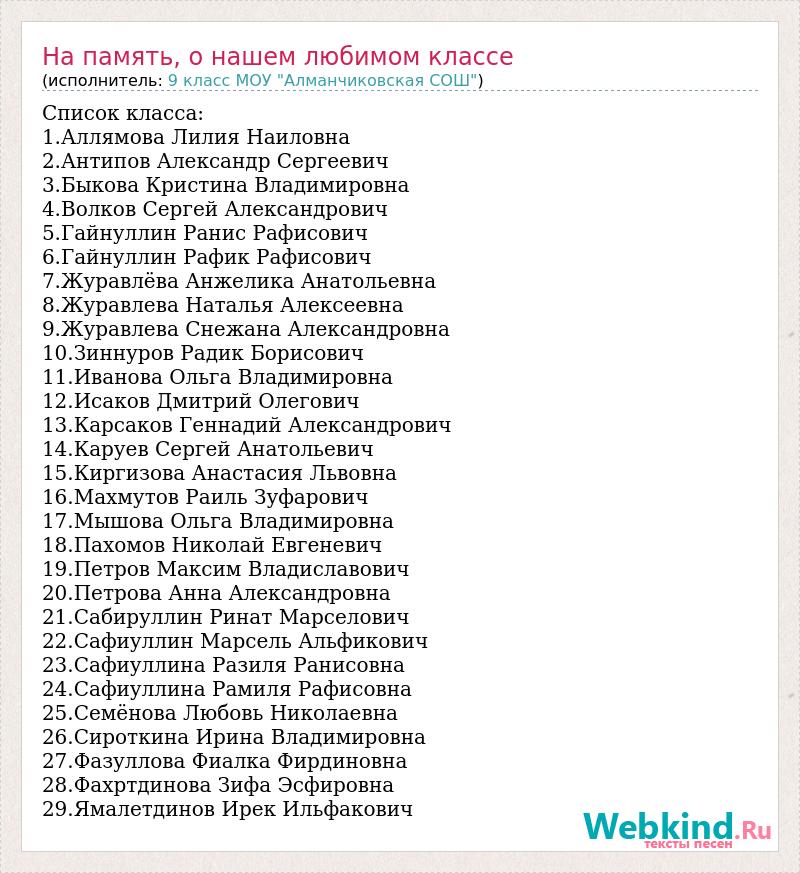 Список класса: 1.Аллямова Лилия Наиловна 2.Антипов Александр Сергеевич 3.Быкова Кристина Владимировна 4.Волков Сергей Александрович 5.Гайнуллин Ранис Рафисович 6.Гайнуллин Рафик Рафисович 7.Журавлёва Анжелика Анатольевна 8.Журавлева Наталья Алексеевна 9.Журавлева Снежана Александровна 10.Зиннуров Радик Борисович 11.Иванова Ольга Владимировна 12.Исаков Дмитрий Олегович 13.Карсаков Геннадий Александрович 14.Каруев Сергей Анатольевич 15.Киргизова Анастасия Львовна 16.Махмутов Раиль Зуфарович 17.Мышова Ольга Владимировна 18.Пахомов Николай Евгеневич 19.Петров Максим Владиславович 20.Петрова Анна Александровна 21.Сабируллин Ринат Марселович 22.Сафиуллин Марсель Альфикович 23.Сафиуллина Разиля Ранисовна 24.Сафиуллина Рамиля Рафисовна 25.Семёнова Любовь Николаевна 26.Сироткина Ирина Владимировна 27.Фазуллова Фиалка Фирдиновна 28.Фахртдинова Зифа Эсфировна 29.Ямалетдинов Ирек Ильфакович