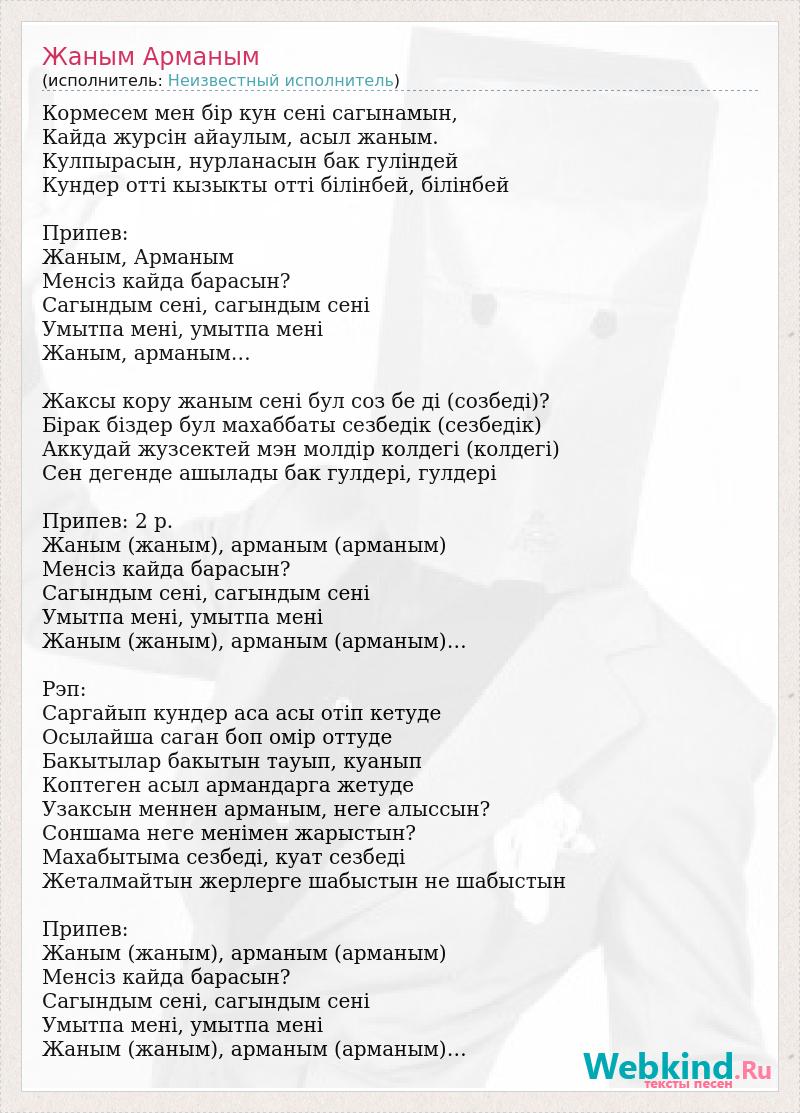 Кормесем мен бiр кун сенi сагынамын, Кайда журсiн айаулым, асыл жаным. Кулпырасын, нурланасын бак гулiндей Кундер оттi кызыкты оттi бiлiнбей, бiлiнбей Припев: Жаным, Арманым Менсiз кайда барасын? Сагындым сенi, сагындым сенi Умытпа менi, умытпа менi Жаным, арманым… Жаксы кору жаным сенi бул соз бе дi (созбедi)? Бiрак бiздер бул махаббаты сезбедiк (сезбедiк) Аккудай жузсектей мэн молдiр колдегi (колдегi) Cен дегенде ашылады бак гулдерi, гулдерi Припев: 2 р. Жаным (жаным), арманым (арманым) Менсiз кайда барасын? Сагындым сенi, сагындым сенi Умытпа менi, умытпа менi Жаным (жаным), арманым (арманым)… Рэп: Саргайып кундер аса асы отiп кетуде Осылайша саган боп омiр оттуде Бакытылар бакытын тауып, куанып Коптеген асыл армандарга жетуде Узаксын меннен арманым, неге алыссын? Соншама неге менiмен жарыстын? Махабытыма сезбедi, куат сезбедi Жеталмайтын жерлерге шабыстын не шабыстын Припев: Жаным (жаным), арманым (арманым) Менсiз кайда барасын? Сагындым сенi, сагындым сенi Умытпа менi, умытпа менi Жаным (жаным), арманым (арманым)…