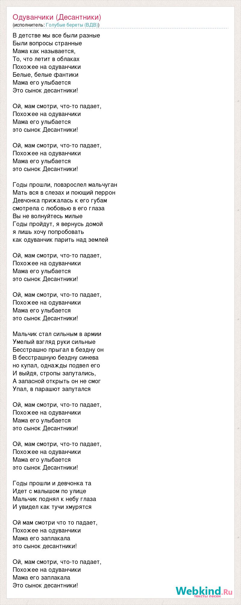 В детстве мы все были разные Были вопросы странные Мама как называется, То, что летит в облаках Похожее на одуванчики Белые, белые фантики Мама его улыбается Это сынок десантники! Ой, мам смотри, что-то падает, Похожее на одуванчики Мама его улыбается это сынок Десантники! Ой, мам смотри, что-то падает, Похожее на одуванчики Мама его улыбается это сынок Десантники! Годы прошли, повзрослел мальчуган Мать вся в слезах и поющий перрон Девчонка прижалась к его губам смотрела с любовью в его глаза Вы не волнуйтесь милые Годы пройдут, я вернусь домой я лишь хочу попробовать как одуванчик парить над землей Ой, мам смотри, что-то падает, Похожее на одуванчики Мама его улыбается это сынок Десантники! Ой, мам смотри, что-то падает, Похожее на одуванчики Мама его улыбается это сынок Десантники! Мальчик стал сильным в армии Умелый взгляд руки сильные Бесстрашно прыгал в бездну он В бесстрашную бездну синева но купал, однажды подвел его И выйдя, стропы запутались, А запасной открыть он не смог Упал, в парашют запутался Ой, мам смотри, что-то падает, Похожее на одуванчики Мама его улыбается это сынок Десантники! Ой, мам смотри, что-то падает, Похожее на одуванчики Мама его улыбается это сынок Десантники! Годы прошли и девчонка та Идет с малышом по улице Мальчик поднял к небу глаза И увидел как тучи хмурятся Ой мам смотри что то падает, Похожее на одуванчики Мама его заплакала это сынок десантники! Ой, мам смотри, что-то падает, Похожее на одуванчики Мама его заплакала Это сынок десантники!