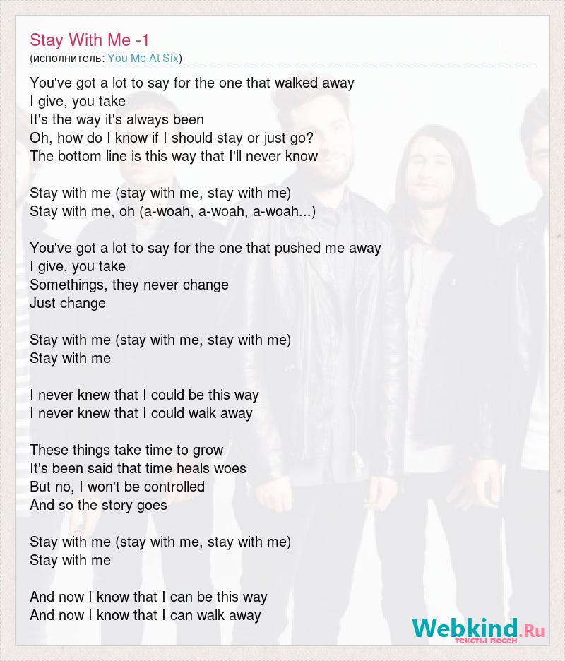 You've got a lot to say for the one that walked away I give, you take It's the way it's always been Oh, how do I know if I should stay or just go? The bottom line is this way that I'll never know Stay with me (stay with me, stay with me) Stay with me, oh (a-woah, a-woah, a-woah...) You've got a lot to say for the one that pushed me away I give, you take Somethings, they never change Just change Stay with me (stay with me, stay with me) Stay with me I never knew that I could be this way I never knew that I could walk away These things take time to grow It's been said that time heals woes But no, I won't be controlled And so the story goes Stay with me (stay with me, stay with me) Stay with me And now I know that I can be this way And now I know that I can walk away