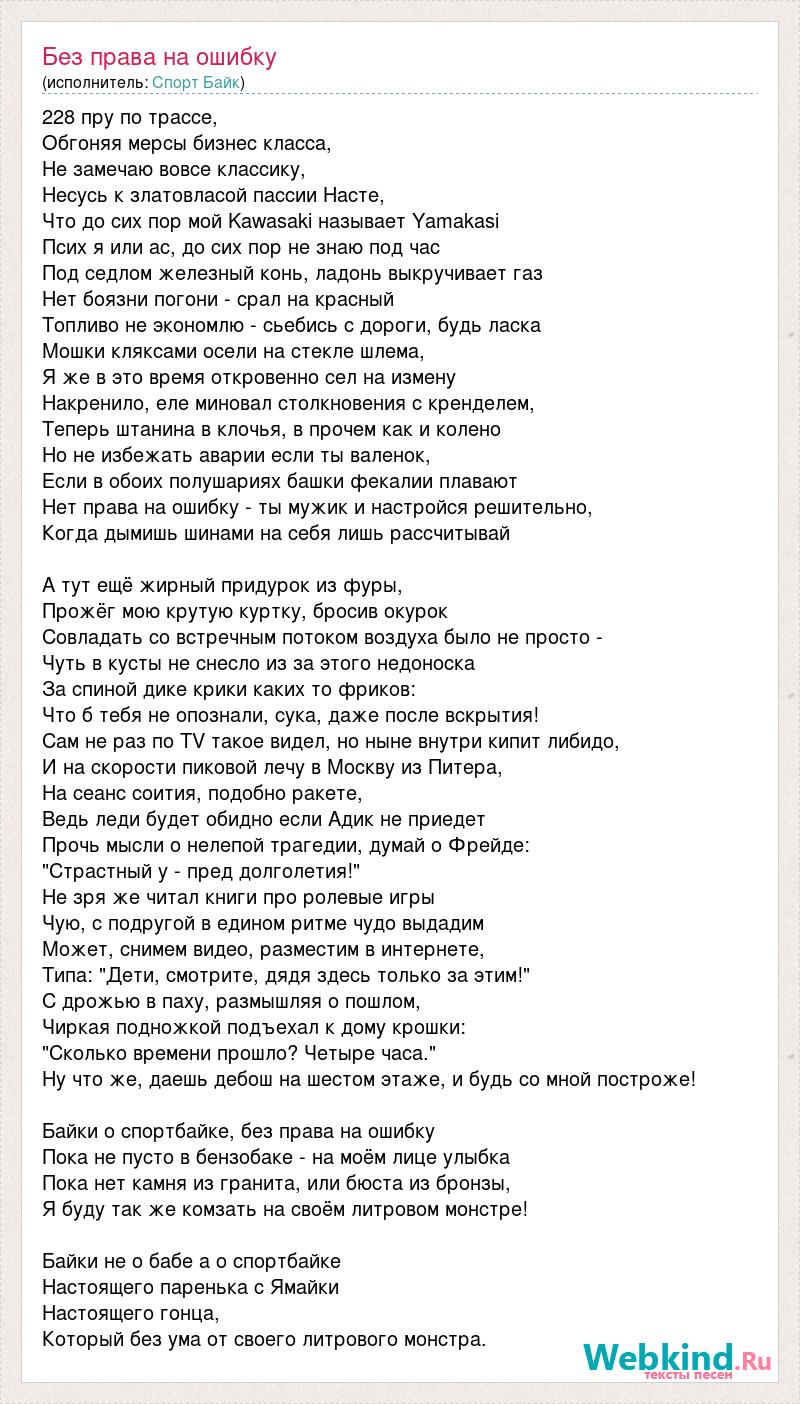 228 пру по трассе, Обгоняя мерсы бизнес класса, Не замечаю вовсе классику, Несусь к златовласой пассии Насте, Что до сих пор мой Kawasaki называет Yamakasi Псих я или ас, до сих пор не знаю под час Под седлом железный конь, ладонь выкручивает газ Нет боязни погони - срал на красный Топливо не экономлю - сьебись с дороги, будь ласка Мошки кляксами осели на стекле шлема, Я же в это время откровенно сел на измену Накренило, еле миновал столкновения с кренделем, Теперь штанина в клочья, в прочем как и колено Но не избежать аварии если ты валенок, Если в обоих полушариях башки фекалии плавают Нет права на ошибку - ты мужик и настройся решительно, Когда дымишь шинами на себя лишь рассчитывай А тут ещё жирный придурок из фуры, Прожёг мою крутую куртку, бросив окурок Совладать со встречным потоком воздуха было не просто - Чуть в кусты не снесло из за этого недоноска За спиной дике крики каких то фриков: Что б тебя не опознали, сука, даже после вскрытия! Сам не раз по TV такое видел, но ныне внутри кипит либидо, И на скорости пиковой лечу в Москву из Питера, На сеанс соития, подобно ракете, Ведь леди будет обидно если Адик не приедет Прочь мысли о нелепой трагедии, думай о Фрейде: "Страстный y - пред долголетия!" Не зря же читал книги про ролевые игры Чую, с подругой в едином ритме чудо выдадим Может, снимем видео, разместим в интернете, Типа: "Дети, смотрите, дядя здесь только за этим!" С дрожью в паху, размышляя о пошлом, Чиркая подножкой подъехал к дому крошки: "Сколько времени прошло? Четыре часа." Ну что же, даешь дебош на шестом этаже, и будь со мной построже! Байки о спортбайке, без права на ошибку Пока не пусто в бензобаке - на моём лице улыбка Пока нет камня из гранита, или бюста из бронзы, Я буду так же комзать на своём литровом монстре! Байки не о бабе а о спортбайке Настоящего паренька с Ямайки Настоящего гонца, Который без ума от своего литрового монстра.
