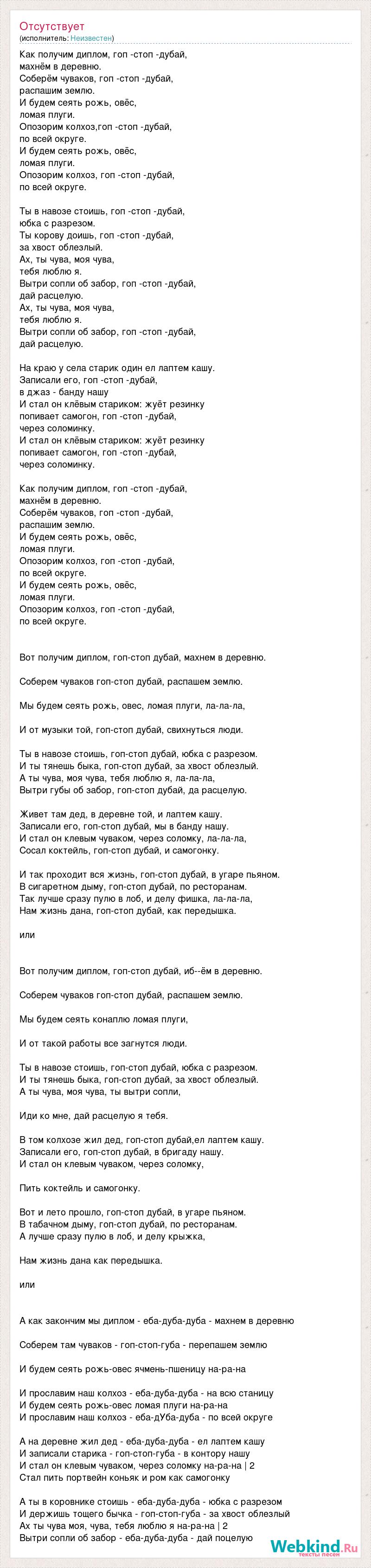 Как получим диплом, гоп -стоп -дубай, махнём в деревню. Соберём чуваков, гоп -стоп -дубай, распашим землю. И будем сеять рожь, овёс, ломая плуги. Опозорим колхоз,гоп -стоп -дубай, по всей округе. И будем сеять рожь, овёс, ломая плуги. Опозорим колхоз, гоп -стоп -дубай, по всей округе. Ты в навозе стоишь, гоп -стоп -дубай, юбка с разрезом. Ты корову доишь, гоп -стоп -дубай, за хвост облезлый. Ах, ты чува, моя чува, тебя люблю я. Вытри сопли об забор, гоп -стоп -дубай, дай расцелую. Ах, ты чува, моя чува, тебя люблю я. Вытри сопли об забор, гоп -стоп -дубай, дай расцелую. На краю у села старик один ел лаптем кашу. Записали его, гоп -стоп -дубай, в джаз - банду нашу И стал он клёвым стариком: жуёт резинку попивает самогон, гоп -стоп -дубай, через соломинку. И стал он клёвым стариком: жуёт резинку попивает самогон, гоп -стоп -дубай, через соломинку. Как получим диплом, гоп -стоп -дубай, махнём в деревню. Соберём чуваков, гоп -стоп -дубай, распашим землю. И будем сеять рожь, овёс, ломая плуги. Опозорим колхоз, гоп -стоп -дубай, по всей округе. И будем сеять рожь, овёс, ломая плуги. Опозорим колхоз, гоп -стоп -дубай, по всей округе. Вот получим диплом, гоп-стоп дубай, махнем в деревню. Соберем чуваков гоп-стоп дубай, распашем землю. Мы будем сеять рожь, овес, ломая плуги, ла-ла-ла, И от музыки той, гоп-стоп дубай, свихнуться люди. Ты в навозе стоишь, гоп-стоп дубай, юбка с разрезом. И ты тянешь быка, гоп-стоп дубай, за хвост облезлый. А ты чува, моя чува, тебя люблю я, ла-ла-ла, Вытри губы об забор, гоп-стоп дубай, да расцелую. Живет там дед, в деревне той, и лаптем кашу. Записали его, гоп-стоп дубай, мы в банду нашу. И стал он клевым чуваком, через соломку, ла-ла-ла, Сосал коктейль, гоп-стоп дубай, и самогонку. И так проходит вся жизнь, гоп-стоп дубай, в угаре пьяном. В сигаретном дыму, гоп-стоп дубай, по ресторанам. Так лучше сразу пулю в лоб, и делу фишка, ла-ла-ла, Нам жизнь дана, гоп-стоп дубай, как передышка. или Вот получим диплом, гоп-стоп дубай, иб--ём в деревню. Соберем чуваков гоп-стоп дубай, распашем землю. Мы будем сеять конаплю ломая плуги, И от такой работы все загнутся люди. Ты в навозе стоишь, гоп-стоп дубай, юбка с разрезом. И ты тянешь быка, гоп-стоп дубай, за хвост облезлый. А ты чува, моя чува, ты вытри сопли, Иди ко мне, дай расцелую я тебя. В том колхозе жил дед, гоп-стоп дубай,ел лаптем кашу. Записали его, гоп-стоп дубай, в бригаду нашу. И стал он клевым чуваком, через соломку, Пить коктейль и самогонку. Вот и лето прошло, гоп-стоп дубай, в угаре пьяном. В табачном дыму, гоп-стоп дубай, по ресторанам. А лучше сразу пулю в лоб, и делу крыжка, Нам жизнь дана как передышка. или А как закончим мы диплом - еба-дуба-дуба - махнем в деревню Соберем там чуваков - гоп-стоп-губа - перепашем землю И будем сеять рожь-овес ячмень-пшеницу на-ра-на И прославим наш колхоз - еба-дуба-дуба - на всю станицу И будем сеять рожь-овес ломая плуги на-ра-на И прославим наш колхоз - еба-дУба-дуба - по всей округе А на деревне жил дед - еба-дуба-дуба - ел лаптем кашу И записали старика - гоп-стоп-губа - в контору нашу И стал он клевым чуваком, через соломку на-ра-на | 2 Стал пить портвейн коньяк и ром как самогонку А ты в коровнике стоишь - еба-дуба-дуба - юбка с разрезом И держишь тощего бычка - гоп-стоп-губа - за хвост облезлый Ах ты чува моя, чува, тебя люблю я на-ра-на | 2 Вытри сопли об забор - еба-дуба-дуба - дай поцелую