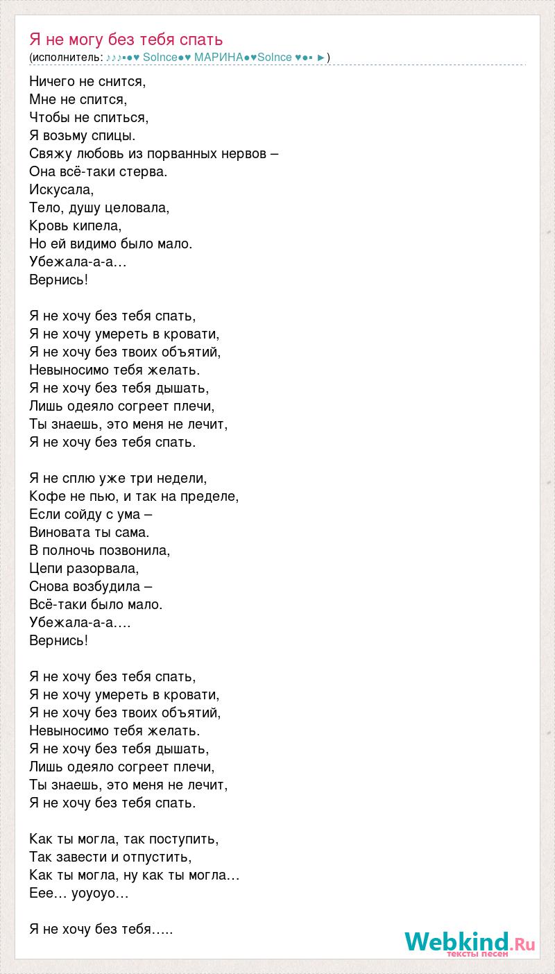 Ничего не снится, Мне не спится, Чтобы не спиться, Я возьму спицы. Свяжу любовь из порванных нервов – Она всё-таки стерва. Искусала, Тело, душу целовала, Кровь кипела, Но ей видимо было мало. Убежала-а-а… Вернись! Я не хочу без тебя спать, Я не хочу умереть в кровати, Я не хочу без твоих объятий, Невыносимо тебя желать. Я не хочу без тебя дышать, Лишь одеяло согреет плечи, Ты знаешь, это меня не лечит, Я не хочу без тебя спать. Я не сплю уже три недели, Кофе не пью, и так на пределе, Если сойду с ума – Виновата ты сама. В полночь позвонила, Цепи разорвала, Снова возбудила – Всё-таки было мало. Убежала-а-а…. Вернись! Я не хочу без тебя спать, Я не хочу умереть в кровати, Я не хочу без твоих объятий, Невыносимо тебя желать. Я не хочу без тебя дышать, Лишь одеяло согреет плечи, Ты знаешь, это меня не лечит, Я не хочу без тебя спать. Как ты могла, так поступить, Так завести и отпустить, Как ты могла, ну как ты могла… Еее… уоуоуо… Я не хочу без тебя…..