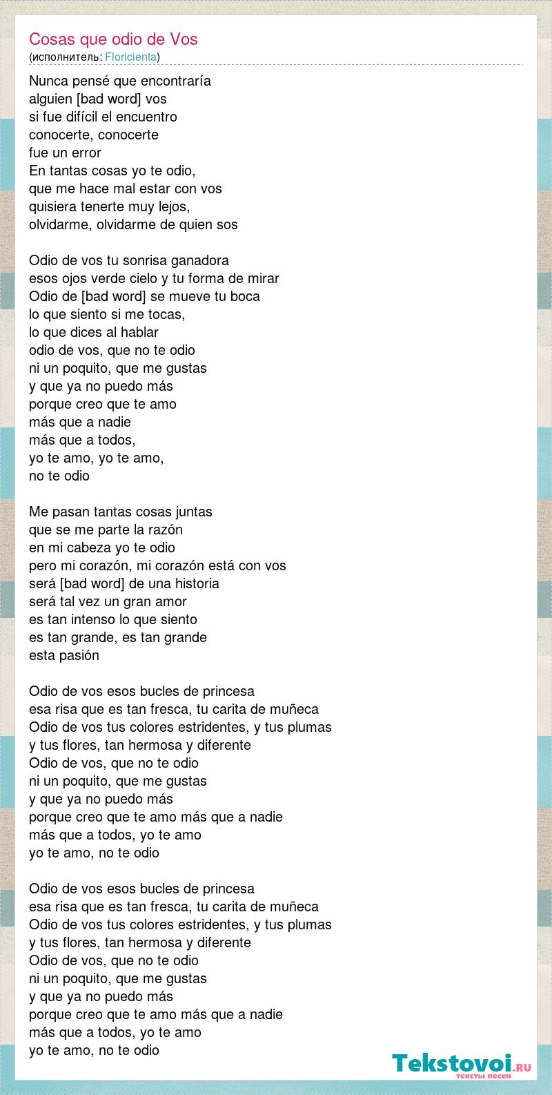 Nunca pensé que encontraría alguien distinto como vos si fue difícil el encuentro conocerte, conocerte fue un error En tantas cosas yo te odio, que me hace mal estar con vos quisiera tenerte muy lejos, olvidarme, olvidarme de quien sos Odio de vos tu sonrisa ganadora esos ojos verde cielo y tu forma de mirar Odio de vos como se mueve tu boca lo que siento si me tocas, lo que dices al hablar odio de vos, que no te odio ni un poquito, que me gustas y que ya no puedo más porque creo que te amo más que a nadie más que a todos, yo te amo, yo te amo, no te odio Me pasan tantas cosas juntas que se me parte la razón en mi cabeza yo te odio pero mi corazón, mi corazón está con vos será el comienzo de una historia será tal vez un gran amor es tan intenso lo que siento es tan grande, es tan grande esta pasión Odio de vos esos bucles de princesa esa risa que es tan fresca, tu carita de muñeca Odio de vos tus colores estridentes, y tus plumas y tus flores, tan hermosa y diferente Odio de vos, que no te odio ni un poquito, que me gustas y que ya no puedo más porque creo que te amo más que a nadie más que a todos, yo te amo yo te amo, no te odio Odio de vos esos bucles de princesa esa risa que es tan fresca, tu carita de muñeca Odio de vos tus colores estridentes, y tus plumas y tus flores, tan hermosa y diferente Odio de vos, que no te odio ni un poquito, que me gustas y que ya no puedo más porque creo que te amo más que a nadie más que a todos, yo te amo yo te amo, no te odio