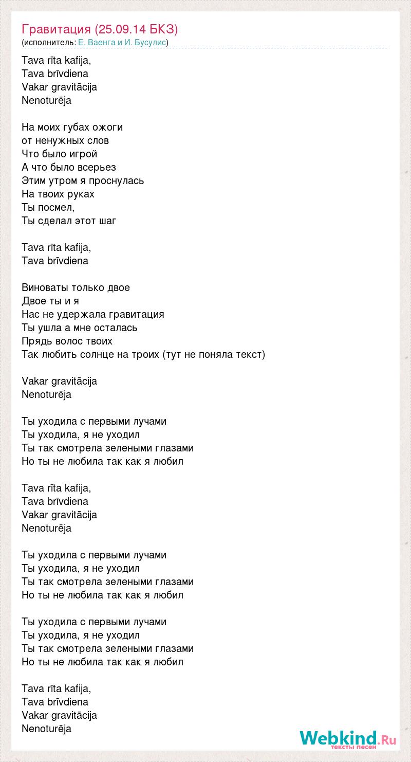 Tava rīta kafija, Tava brīvdiena Vakar gravitācija Nenoturēja На моих губах ожоги от ненужных слов Что было игрой А что было всерьез Этим утром я проснулась На твоих руках Ты посмел, Ты сделал этот шаг Tava rīta kafija, Tava brīvdiena Виноваты только двое Двое ты и я Нас не удержала гравитация Ты ушла а мне осталась Прядь волос твоих Так любить солнце на троих (тут не поняла текст) Vakar gravitācija Nenoturēja Ты уходила с первыми лучами Ты уходила, я не уходил Ты так смотрела зелеными глазами Но ты не любила так как я любил Tava rīta kafija, Tava brīvdiena Vakar gravitācija Nenoturēja Ты уходила с первыми лучами Ты уходила, я не уходил Ты так смотрела зелеными глазами Но ты не любила так как я любил Ты уходила с первыми лучами Ты уходила, я не уходил Ты так смотрела зелеными глазами Но ты не любила так как я любил Tava rīta kafija, Tava brīvdiena Vakar gravitācija Nenoturēja