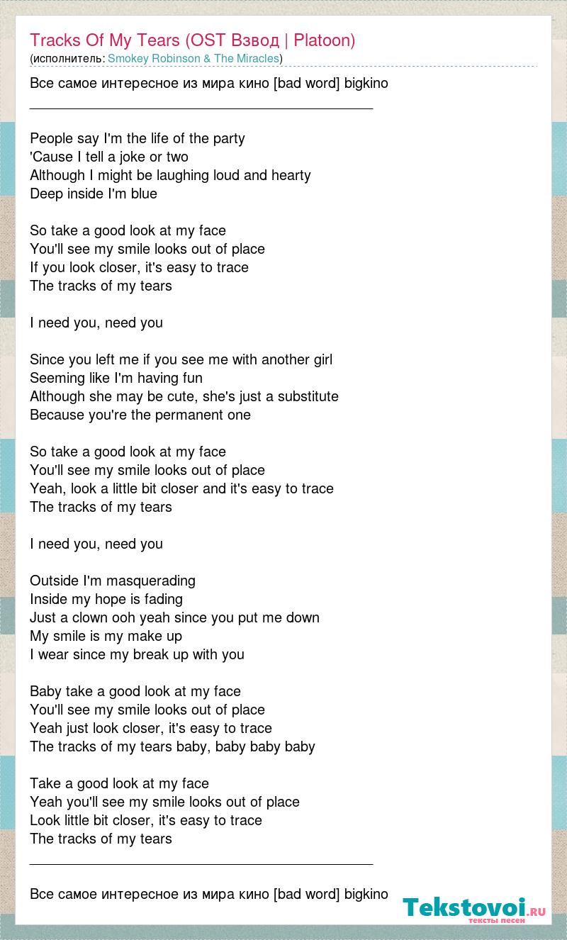Все самое интересное из мира кино [bad word] bigkino ____________________________________________ People say I'm the life of the party 'Cause I tell a joke or two Although I might be laughing loud and hearty Deep inside I'm blue So take a good look at my face You'll see my smile looks out of place If you look closer, it's easy to trace The tracks of my tears I need you, need you Since you left me if you see me with another girl Seeming like I'm having fun Although she may be cute, she's just a substitute Because you're the permanent one So take a good look at my face You'll see my smile looks out of place Yeah, look a little bit closer and it's easy to trace The tracks of my tears I need you, need you Outside I'm masquerading Inside my hope is fading Just a clown ooh yeah since you put me down My smile is my make up I wear since my break up with you Baby take a good look at my face You'll see my smile looks out of place Yeah just look closer, it's easy to trace The tracks of my tears baby, baby baby baby Take a good look at my face Yeah you'll see my smile looks out of place Look little bit closer, it's easy to trace The tracks of my tears ____________________________________________ Все самое интересное из мира кино [bad word] bigkino