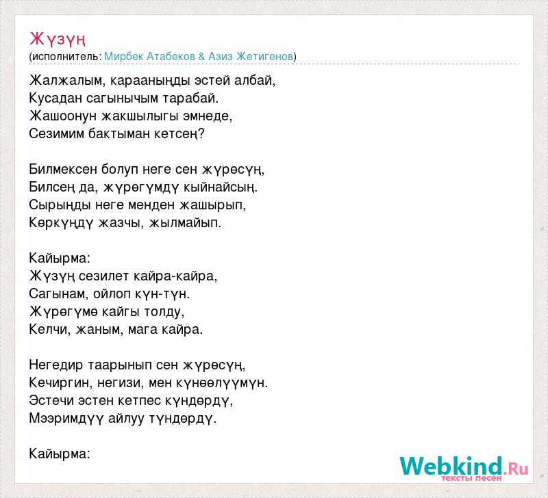 Жалжалым, карааныңды эстей албай, Кусадан сагынычым тарабай. Жашоонун жакшылыгы эмнеде, Сезимим бактыман кетсең? Билмексен болуп неге сен жүрөсүң, Билсең да, жүрөгүмдү кыйнайсың. Сырыңды неге менден жашырып, Көркүңдү жазчы, жылмайып. Кайырма: Жүзүң сезилет кайра-кайра, Сагынам, ойлоп күн-түн. Жүрөгүмө кайгы толду, Келчи, жаным, мага кайра. Негедир таарынып сен жүрөсүң, Кечиргин, негизи, мен күнөөлүүмүн. Эстечи эстен кетпес күндөрдү, Мээримдүү айлуу түндөрдү. Кайырма: