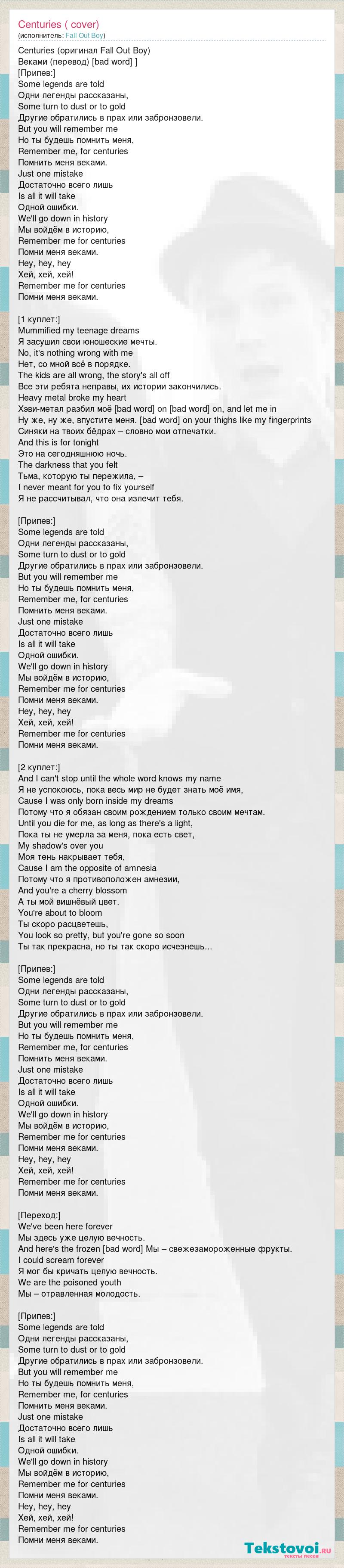 Centuries (оригинал Fall Out Boy) Веками (перевод) [Chorus:] [Припев:] Some legends are told Одни легенды рассказаны, Some turn to dust or to gold Другие обратились в прах или забронзовели. But you will remember me Но ты будешь помнить меня, Remember me, for centuries Помнить меня веками. Just one mistake Достаточно всего лишь Is all it will take Одной ошибки. We'll go down in history Мы войдём в историю, Remember me for centuries Помни меня веками. Hey, hey, hey Хей, хей, хей! Remember me for centuries Помни меня веками. [1 куплет:] Mummified my teenage dreams Я засушил свои юношеские мечты. No, it's nothing wrong with me Нет, со мной всё в порядке. The kids are all wrong, the story's all off Все эти ребята неправы, их истории закончились. Heavy metal broke my heart Хэви-метал разбил моё сердце. Come on, come on, and let me in Ну же, ну же, впустите меня. Bruises on your thighs like my fingerprints Синяки на твоих бёдрах – словно мои отпечатки. And this is for tonight Это на сегодняшнюю ночь. The darkness that you felt Тьма, которую ты пережила, – I never meant for you to fix yourself Я не рассчитывал, что она излечит тебя. [Припев:] Some legends are told Одни легенды рассказаны, Some turn to dust or to gold Другие обратились в прах или забронзовели. But you will remember me Но ты будешь помнить меня, Remember me, for centuries Помнить меня веками. Just one mistake Достаточно всего лишь Is all it will take Одной ошибки. We'll go down in history Мы войдём в историю, Remember me for centuries Помни меня веками. Hey, hey, hey Хей, хей, хей! Remember me for centuries Помни меня веками. [2 куплет:] And I can't stop until the whole word knows my name Я не успокоюсь, пока весь мир не будет знать моё имя, Cause I was only born inside my dreams Потому что я обязан своим рождением только своим мечтам. Until you die for me, as long as there's a light, Пока ты не умерла за меня, пока есть свет, My shadow's over you Моя тень накрывает тебя, Cause I am the opposite of amnesia Потому что я противоположен амнезии, And you're a cherry blossom А ты мой вишнёвый цвет. You're about to bloom Ты скоро расцветешь, You look so pretty, but you're gone so soon Ты так прекрасна, но ты так скоро исчезнешь... [Припев:] Some legends are told Одни легенды рассказаны, Some turn to dust or to gold Другие обратились в прах или забронзовели. But you will remember me Но ты будешь помнить меня, Remember me, for centuries Помнить меня веками. Just one mistake Достаточно всего лишь Is all it will take Одной ошибки. We'll go down in history Мы войдём в историю, Remember me for centuries Помни меня веками. Hey, hey, hey Хей, хей, хей! Remember me for centuries Помни меня веками. [Переход:] We've been here forever Мы здесь уже целую вечность. And here's the frozen fruit Мы – свежезамороженные фрукты. I could scream forever Я мог бы кричать целую вечность. We are the poisoned youth Мы – отравленная молодость. [Припев:] Some legends are told Одни легенды рассказаны, Some turn to dust or to gold Другие обратились в прах или забронзовели. But you will remember me Но ты будешь помнить меня, Remember me, for centuries Помнить меня веками. Just one mistake Достаточно всего лишь Is all it will take Одной ошибки. We'll go down in history Мы войдём в историю, Remember me for centuries Помни меня веками. Hey, hey, hey Хей, хей, хей! Remember me for centuries Помни меня веками.