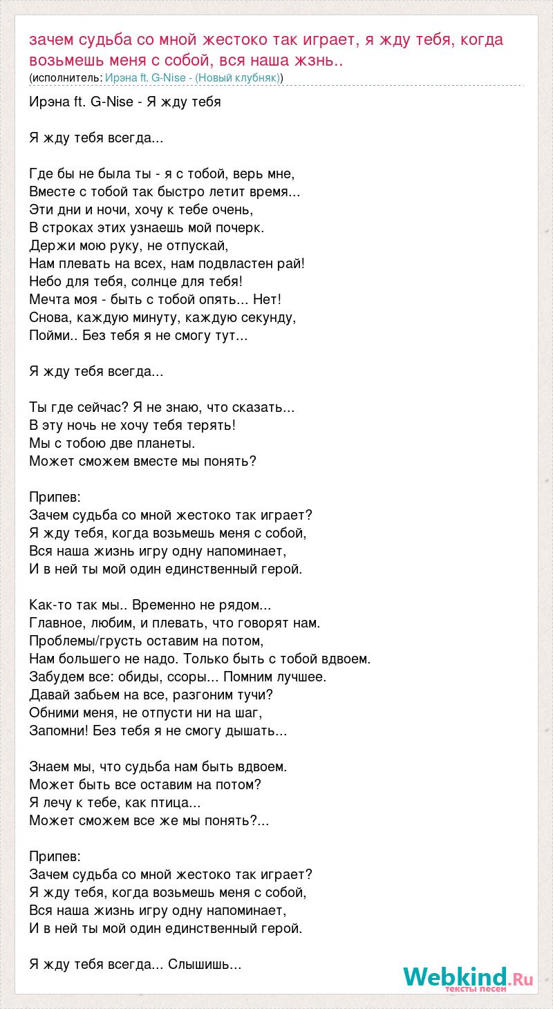 Ирэна ft. G-Nise - Я жду тебя Я жду тебя всегда... Где бы не была ты - я с тобой, верь мне, Вместе с тобой так быстро летит время... Эти дни и ночи, хочу к тебе очень, В строках этих узнаешь мой почерк. Держи мою руку, не отпускай, Нам плевать на всех, нам подвластен рай! Небо для тебя, солнце для тебя! Мечта моя - быть с тобой опять... Нет! Снова, каждую минуту, каждую секунду, Пойми.. Без тебя я не смогу тут... Я жду тебя всегда... Ты где сейчас? Я не знаю, что сказать... В эту ночь не хочу тебя терять! Мы с тобою две планеты. Может сможем вместе мы понять? Припев: Зачем судьба со мной жестоко так играет? Я жду тебя, когда возьмешь меня с собой, Вся наша жизнь игру одну напоминает, И в ней ты мой один единственный герой. Как-то так мы.. Временно не рядом... Главное, любим, и плевать, что говорят нам. Проблемы/грусть оставим на потом, Нам большего не надо. Только быть с тобой вдвоем. Забудем все: обиды, ссоры... Помним лучшее. Давай забьем на все, разгоним тучи? Обними меня, не отпусти ни на шаг, Запомни! Без тебя я не смогу дышать... Знаем мы, что судьба нам быть вдвоем. Может быть все оставим на потом? Я лечу к тебе, как птица... Может сможем все же мы понять?... Припев: Зачем судьба со мной жестоко так играет? Я жду тебя, когда возьмешь меня с собой, Вся наша жизнь игру одну напоминает, И в ней ты мой один единственный герой. Я жду тебя всегда... Слышишь...