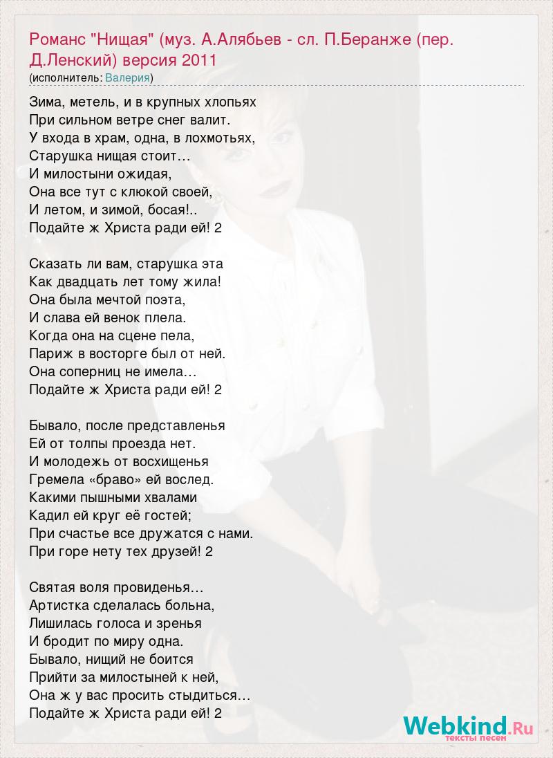 Главная→Исполнители→Валерия→Романс "Нищая" (муз. А.Алябьев - сл. П.Беранже (пер. Д.Ленский) версия 2011