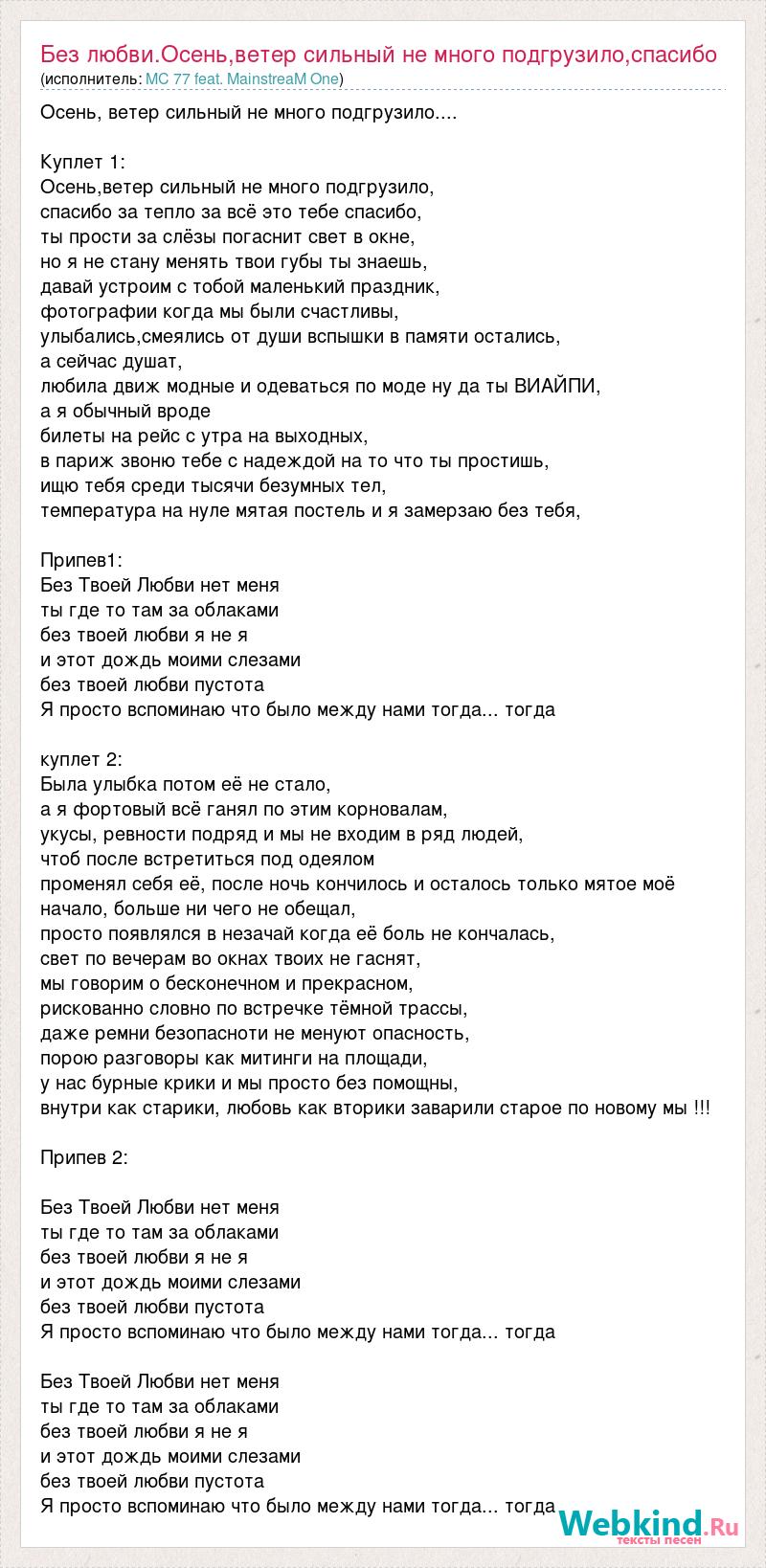 Осень, ветер сильный не много подгрузило.... Куплет 1: Осень,ветер сильный не много подгрузило, спасибо за тепло за всё это тебе спасибо, ты прости за слёзы погаснит свет в окне, но я не стану менять твои губы ты знаешь, давай устроим с тобой маленький праздник, фотографии когда мы были счастливы, улыбались,смеялись от души вспышки в памяти остались, а сейчас душат, любила движ модные и одеваться по моде ну да ты ВИАЙПИ, а я обычный вроде билеты на рейс с утра на выходных, в париж звоню тебе с надеждой на то что ты простишь, ищю тебя среди тысячи безумных тел, температура на нуле мятая постель и я замерзаю без тебя, Припев1: Без Твоей Любви нет меня ты где то там за облаками без твоей любви я не я и этот дождь моими слезами без твоей любви пустота Я просто вспоминаю что было между нами тогда... тогда куплет 2: Была улыбка потом её не стало, а я фортовый всё ганял по этим корновалам, укусы, ревности подряд и мы не входим в ряд людей, чтоб после встретиться под одеялом променял себя её, после ночь кончилось и осталось только мятое моё начало, больше ни чего не обещал, просто появлялся в незачай когда её боль не кончалась, свет по вечерам во окнах твоих не гаснят, мы говорим о бесконечном и прекрасном, рискованно словно по встречке тёмной трассы, даже ремни безопасноти не менуют опасность, порою разговоры как митинги на площади, у нас бурные крики и мы просто без помощны, внутри как старики, любовь как вторики заварили старое по новому мы !!! Припев 2: Без Твоей Любви нет меня ты где то там за облаками без твоей любви я не я и этот дождь моими слезами без твоей любви пустота Я просто вспоминаю что было между нами тогда... тогда Без Твоей Любви нет меня ты где то там за облаками без твоей любви я не я и этот дождь моими слезами без твоей любви пустота Я просто вспоминаю что было между нами тогда... тогда