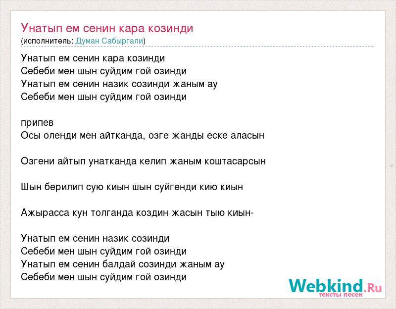 Унатып ем сенин кара козинди Себеби мен шын суйдим гой озинди Унатып ем сенин назик созинди жаным ау Себеби мен шын суйдим гой озинди припев Осы оленди мен айтканда, озге жанды еске аласын Озгени айтып унатканда келип жаным коштасарсын Шын берилип сую киын шын суйгенди кию киын Ажырасса кун толганда коздин жасын тыю киын- Унатып ем сенин назик созинди Себеби мен шын суйдим гой озинди Унатып ем сенин балдай созинди жаным ау Себеби мен шын суйдим гой озинди