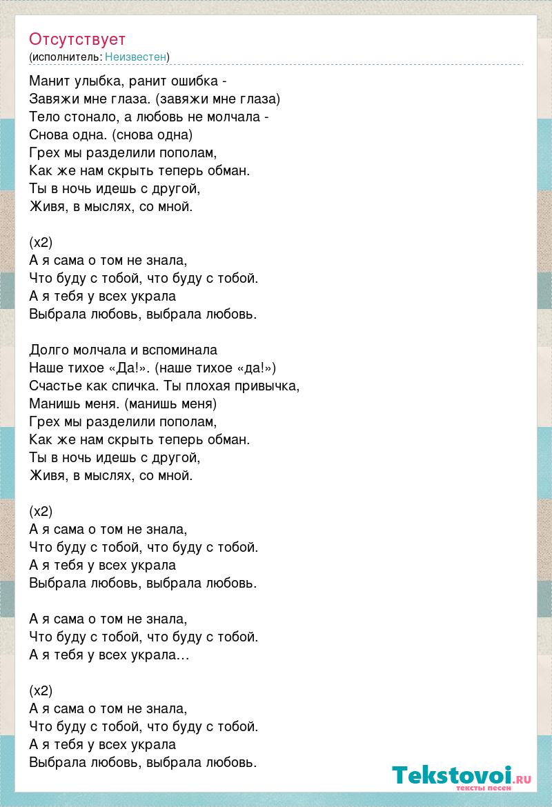 Манит улыбка, ранит ошибка - Завяжи мне глаза. (завяжи мне глаза) Тело стонало, а любовь не молчала - Снова одна. (снова одна) Грех мы разделили пополам, Как же нам скрыть теперь обман. Ты в ночь идешь с другой, Живя, в мыслях, со мной. (х2) А я сама о том не знала, Что буду с тобой, что буду с тобой. А я тебя у всех украла Выбрала любовь, выбрала любовь. Долго молчала и вспоминала Наше тихое «Да!». (наше тихое «да!») Счастье как спичка. Ты плохая привычка, Манишь меня. (манишь меня) Грех мы разделили пополам, Как же нам скрыть теперь обман. Ты в ночь идешь с другой, Живя, в мыслях, со мной. (х2) А я сама о том не знала, Что буду с тобой, что буду с тобой. А я тебя у всех украла Выбрала любовь, выбрала любовь. А я сама о том не знала, Что буду с тобой, что буду с тобой. А я тебя у всех украла… (х2) А я сама о том не знала, Что буду с тобой, что буду с тобой. А я тебя у всех украла Выбрала любовь, выбрала любовь.