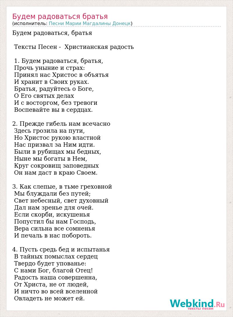 Будем радоваться, братья Тексты Песен - Христианская радость 1. Будем радоваться, братья, Прочь уныние и страх: Принял нас Христос в объятья И хранит в Своих руках. Братья, радуйтесь о Боге, О Его святых делах И с восторгом, без тревоги Воспевайте вы в сердцах. 2. Прежде гибель нам всечасно Здесь грозила на пути, Но Христос рукою властной Нас призвал за Ним идти. Были в рубищах мы бедных, Ныне мы богаты в Нем, Круг сокровищ заповедных Он нам даст в краю Своем. 3. Как слепые, в тьме греховной Мы блуждали без путей; Свет небесный, свет духовный Дал нам зренье для очей. Если скорби, искушенья Попустил бы нам Господь, Вера сильна все сомненья И печаль в нас побороть. 4. Пусть средь бед и испытанья В тайных помыслах сердец Твердо будет упованье: С нами Бог, благой Отец! Радость наша совершенна, От Христа, не от людей, И ничто во всей вселенной Овладеть не может ей.