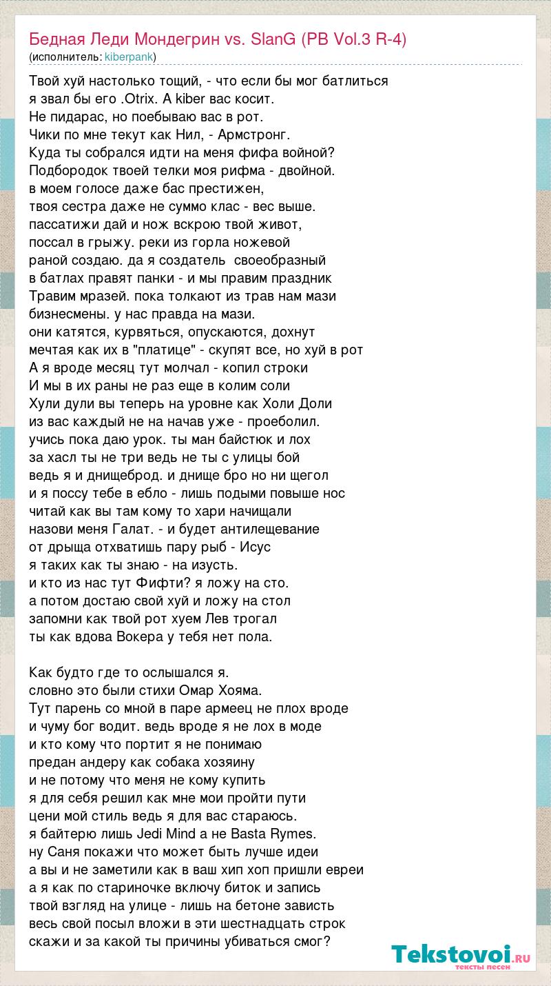 Твой хуй настолько тощий, - что если бы мог батлиться я звал бы его .Otrix. А kiber вас косит. Не пидарас, но поебываю вас в рот. Чики по мне текут как Нил, - Армстронг. Куда ты собрался идти на меня фифа войной? Подбородок твоей телки моя рифма - двойной. в моем голосе даже бас престижен, твоя сестра даже не суммо клас - вес выше. пассатижи дай и нож вскрою твой живот, поссал в грыжу. реки из горла ножевой раной создаю. да я создатель своеобразный в батлах правят панки - и мы правим праздник Травим мразей. пока толкают из трав нам мази бизнесмены. у нас правда на мази. они катятся, курвяться, опускаются, дохнут мечтая как их в "платице" - скупят все, но хуй в рот А я вроде месяц тут молчал - копил строки И мы в их раны не раз еще в колим соли Хули дули вы теперь на уровне как Холи Доли из вас каждый не на начав уже - проеболил. учись пока даю урок. ты ман байстюк и лох за хасл ты не три ведь не ты с улицы бой ведь я и днищеброд. и днище бро но ни щегол и я поссу тебе в ебло - лишь подыми повыше нос читай как вы там кому то хари начищали назови меня Галат. - и будет антилещевание от дрыща отхватишь пару рыб - Исус я таких как ты знаю - на изусть. и кто из нас тут Фифти? я ложу на сто. а потом достаю свой хуй и ложу на стол запомни как твой рот хуем Лев трогал ты как вдова Вокера у тебя нет пола. Как будто где то ослышался я. словно это были стихи Омар Хояма. Тут парень со мной в паре армеец не плох вроде и чуму бог водит. ведь вроде я не лох в моде и кто кому что портит я не понимаю предан андеру как собака хозяину и не потому что меня не кому купить я для себя решил как мне мои пройти пути цени мой стиль ведь я для вас стараюсь. я байтерю лишь Jedi Mind а не Basta Rymes. ну Саня покажи что может быть лучше идеи а вы и не заметили как в ваш хип хоп пришли евреи а я как по стариночке включу биток и запись твой взгляд на улице - лишь на бетоне зависть весь свой посыл вложи в эти шестнадцать строк скажи и за какой ты причины убиваться смог?