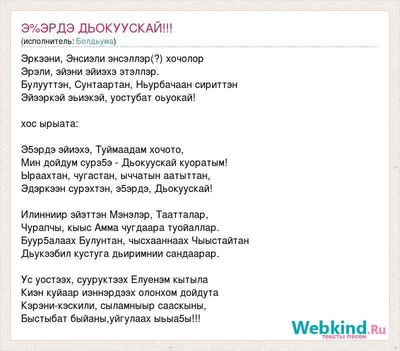 Эркээни, Энсиэли энсэллэр(?) хочолор Эрэли, эйэни эйиэхэ этэллэр. Булууттэн, Сунтаартан, Ньурбачаан сириттэн Эйээркэй эьиэкэй, уостубат оьуокай! хос ырыата: Э5эрдэ эйиэхэ, Туймаадам хочото, Мин дойдум сурэ5э - Дьокуускай куоратым! Ыраахтан, чугастан, ыччатын аатыттан, Эдэркээн сурэхтэн, э5эрдэ, Дьокуускай! Илинниир эйэттэн Мэнэлэр, Таатталар, Чурапчы, кыыс Амма чугдаара туойаллар. Буур5алаах Булунтан, чысхааннаах Чыыстайтан Дьукээбил кустуга дьиримнии сандаарар. Ус уостээх, сууруктээх Елуенэм кытыла Киэн куйаар иэннэрдээх олонхом дойдута Кэрэни-кэскили, сыламныыр сааскыны, Быстыбат быйаны,уйгулаах ыьыа5ы!!!