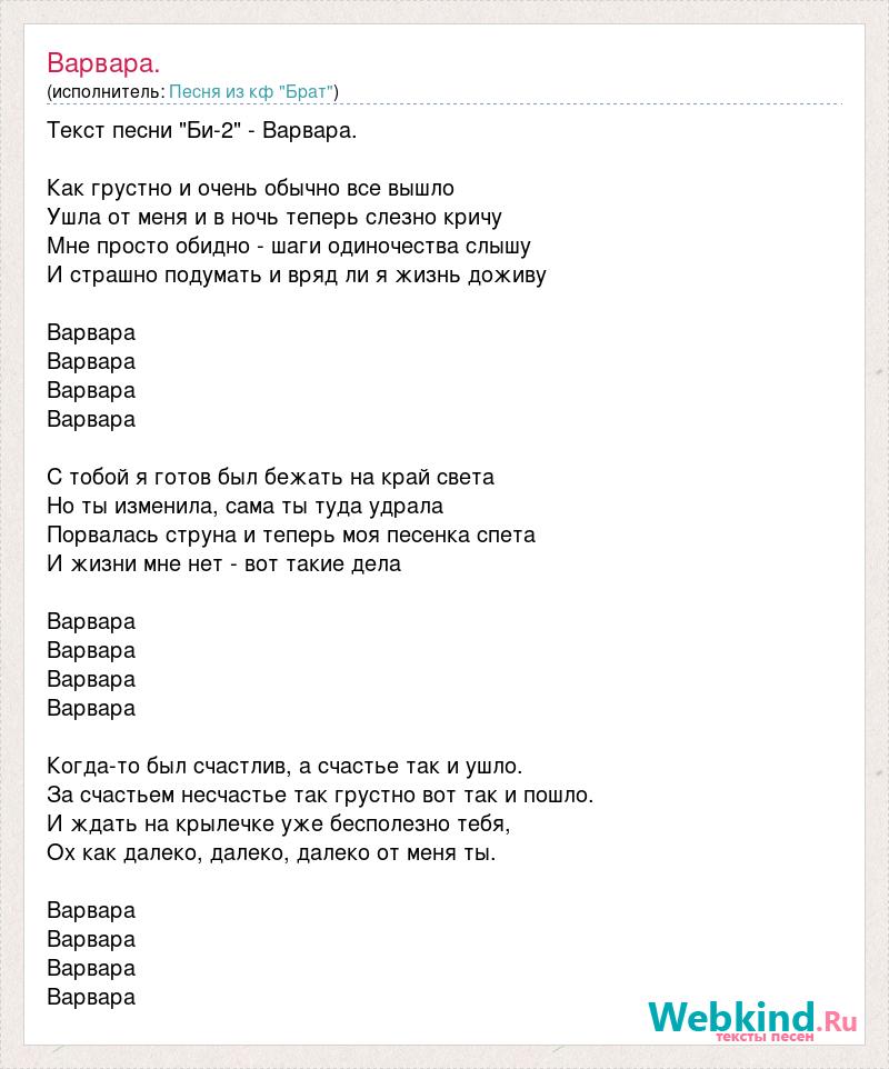 Текст песни "Би-2" - Варвара. Как грустно и очень обычно все вышло Ушла от меня и в ночь теперь слезно кричу Мне просто обидно - шаги одиночества слышу И страшно подумать и вряд ли я жизнь доживу Варвара Варвара Варвара Варвара С тобой я готов был бежать на край света Но ты изменила, сама ты туда удрала Порвалась струна и теперь моя песенка спета И жизни мне нет - вот такие дела Варвара Варвара Варвара Варвара Когда-то был счастлив, а счастье так и ушло. За счастьем несчастье так грустно вот так и пошло. И ждать на крылечке уже бесполезно тебя, Ох как далеко, далеко, далеко от меня ты. Варвара Варвара Варвара Варвара