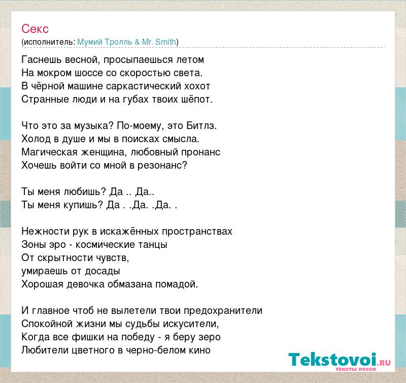 Гаснешь весной, просыпаешься летом На мокром шоссе со скоростью света. В чёрной машине саркастический хохот Странные люди и на губах твоих шёпот. Что это за музыка? По-моему, это Битлз. Холод в душе и мы в поисках смысла. Магическая женщина, любовный пронанс Хочешь войти со мной в резонанс? Ты меня любишь? Да .. Да.. Ты меня купишь? Да . .Да. .Да. . Нежности рук в искажённых пространствах Зоны эро - космические танцы От скрытности чувств, умираешь от досады Хорошая девочка обмазана помадой. И главное чтоб не вылетели твои предохранители Спокойной жизни мы судьбы искусители, Когда все фишки на победу - я беру зеро Любители цветного в черно-белом кино