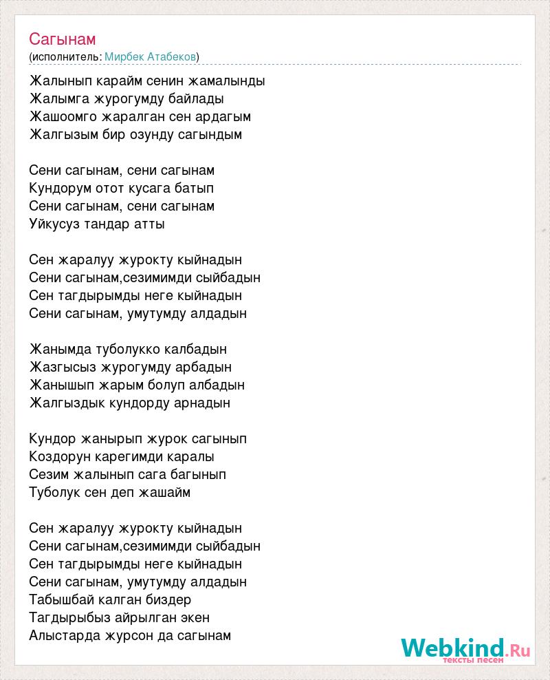 Жалынып карайм сенин жамалынды Жалымга журогумду байлады Жашоомго жаралган сен ардагым Жалгызым бир озунду сагындым Сени сагынам, сени сагынам Кундорум отот кусага батып Сени сагынам, сени сагынам Уйкусуз тандар атты Сен жаралуу журокту кыйнадын Сени сагынам,сезимимди сыйбадын Сен тагдырымды неге кыйнадын Сени сагынам, умутумду алдадын Жанымда туболукко калбадын Жазгысыз журогумду арбадын Жанышып жарым болуп албадын Жалгыздык кундорду арнадын Кундор жанырып журок сагынып Коздорун карегимди каралы Сезим жалынып сага багынып Туболук сен деп жашайм Сен жаралуу журокту кыйнадын Сени сагынам,сезимимди сыйбадын Сен тагдырымды неге кыйнадын Сени сагынам, умутумду алдадын Табышбай калган биздер Тагдырыбыз айрылган экен Алыстарда журсон да сагынам