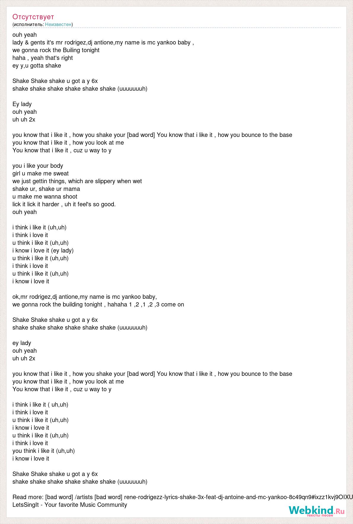 ouh yeah lady & gents it's mr rodrigez,dj antione,my name is mc yankoo baby , we gonna rock the Builing tonight haha , yeah that's right ey y,u gotta shake Shake Shake shake u got a y 6x shake shake shake shake shake shake (uuuuuuuh) Ey lady ouh yeah uh uh 2x you know that i like it , how you shake your [bad word] You know that i like it , how you bounce to the base you know that i like it , how you look at me You know that i like it , cuz u way to y you i like your body girl u make me sweat we just gettin things, which are slippery when wet shake ur, shake ur mama u make me wanna shoot lick it lick it harder , uh it feel's so good. ouh yeah i think i like it (uh,uh) i think i love it u think i like it (uh,uh) i know i love it (ey lady) u think i like it (uh,uh) i think i love it u think i like it (uh,uh) i know i love it ok,mr rodrigez,dj antione,my name is mc yankoo baby, we gonna rock the building tonight , hahaha 1 ,2 ,1 ,2 ,3 come on Shake Shake shake u got a y 6x shake shake shake shake shake shake (uuuuuuuh) ey lady ouh yeah uh uh 2x you know that i like it , how you shake your [bad word] You know that i like it , how you bounce to the base you know that i like it , how you look at me You know that i like it , cuz u way to y i think i like it ( uh,uh) i think i love it u think i like it (uh,uh) i know i love it u think i like it (uh,uh) i think i love it you think i like it (uh,uh) i know i love it Shake Shake shake u got a y 6x shake shake shake shake shake shake (uuuuuuuh) Read more: [bad word] /artists [bad word] rene-rodrigezz-lyrics-shake-3x-feat-dj-antoine-and-mc-yankoo-8c49qn9#ixzz1kvj9OIXU LetsSingIt - Your favorite Music Community
