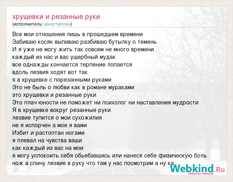 Все мои отношения лишь в прошедшем времени Забиваю косяк выпиваю разбиваю бутылку о темень И я уже не могу жить так совсем не много времени каждый из нас и вас ущербный мудак все однажды кончается терпение лопается вдоль лезвия ходят вот так я в хрущевке с порезанными руками Это не быль о любви как в романе мураками это хрущевки и резанные руки Это плач юности не поможет ни психолог ни наставления мудрости Я в хрущевке вокруг резанные руки лезвие тупится о мои сухожилия не я испорчен а мое я вами Избит и растоптан ногами я плевал на чувства ваши как каждый из вас на мои я могу успокоить себя обьебавшись или нанеся себе физическую боль нож в спину лезвие в руку что там у нас посмотрим а ну ка