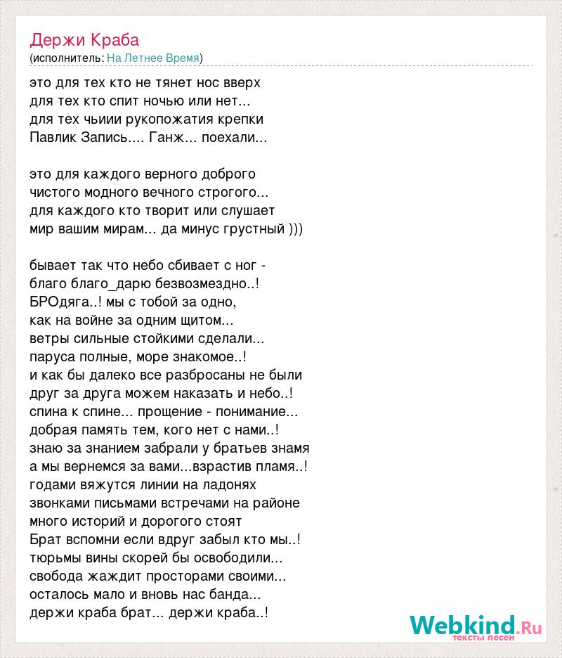 это для тех кто не тянет нос вверх для тех кто спит ночью или нет... для тех чьиии рукопожатия крепки Павлик Запись.... Ганж... поехали... это для каждого верного доброго чистого модного вечного строгого... для каждого кто творит или слушает мир вашим мирам... да минус грустный ))) бывает так что небо сбивает с ног - благо благо_дарю безвозмездно..! БРОдяга..! мы с тобой за одно, как на войне за одним щитом... ветры сильные стойкими сделали... паруса полные, море знакомое..! и как бы далеко все разбросаны не были друг за друга можем наказать и небо..! спина к спине... прощение - понимание... добрая память тем, кого нет с нами..! знаю за знанием забрали у братьев знамя а мы вернемся за вами...взрастив пламя..! годами вяжутся линии на ладонях звонками письмами встречами на районе много историй и дорогого стоят Брат вспомни если вдруг забыл кто мы..! тюрьмы вины скорей бы освободили... свобода жаждит просторами своими... осталось мало и вновь нас банда... держи краба брат... держи краба..!